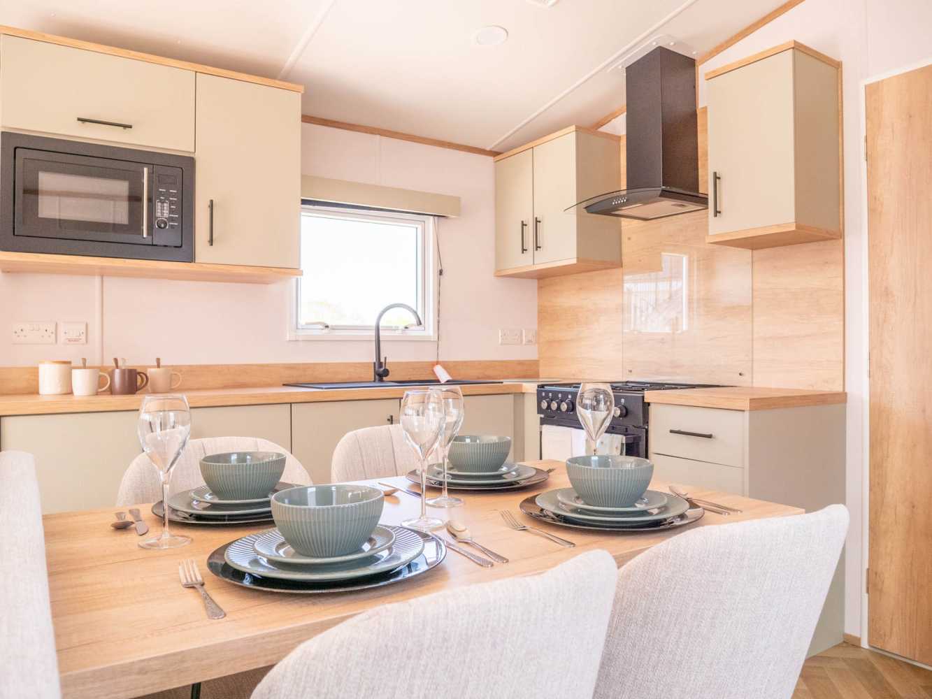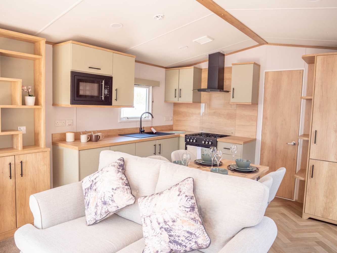 Welcome to the Victory Parkview Lodge. Step into a spacious open-plan lounge area where herringbone flooring, marble-style worktops, and statement feature walls create a warm and inviting atmosphere. The lounge is perfect for unwinding after a day exploring the English Riviera, offering a cosy spot to relax with a book or enjoy quality time with loved ones.