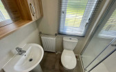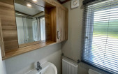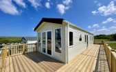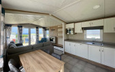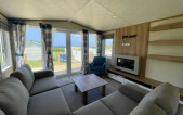 The Marlow, a bestseller from Pemberton and a popular choice among our caravan owners. Featuring an open-plan living space and central dining position, making it the perfect layout to make the most of the sea views overlooking Newgale beach. The sleek low level furniture in the lounge and chunky shelving is minimalistic in style creating a modern look. The teal colour scheme found in the curtains and accent chair, compliments the contemporary style whilst adding an air of tasteful elegance. Kitchen highlights include copious storage, white Shaker style doors, a generous counter top and an integrated microwave. Our favourite features include: -Open plan living space. -Wall mounted flame effect fire with remote control. -Integrated microwave. -En-suite to master bedroom (toilet & sink). -L-shaped sofa and co-ordinating accent chair with free standing dining table with fabric chairs.