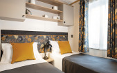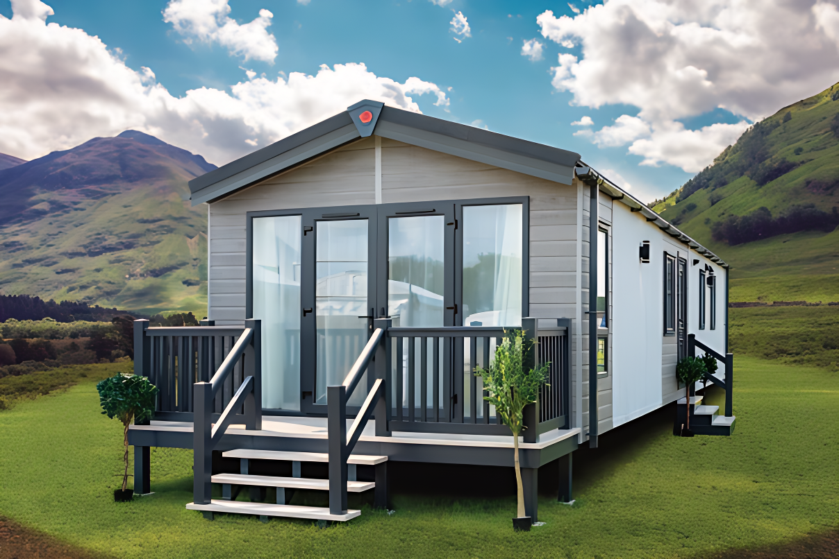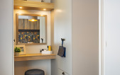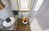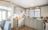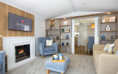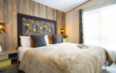Serene blue and cream lounge furnishings sit beautifully against stone and oak coloured fitted furniture. Traditional styling works in harmony with the feature electric fireplace, and carefully designed wall shelves. This range in particular lends itself to a lodge upgrade in one of the many striking Canexel colours. Available in two sizes – 38ft x 12 ft & 42ft x 13ft – the Abingdon feels spacious and well appointed. Select the optional pocket doors for a closed off lounge if you prefer a more cosy setting or to create move privacy when using the sofabed in the lounge. The master bedroom features a plank effect feature wall with ornate wall lights in a blend of rustic meets luxury and wardrobes incorporate a smart dressing table with an upholstered cylinder stool.