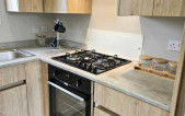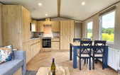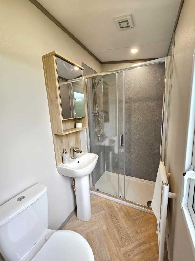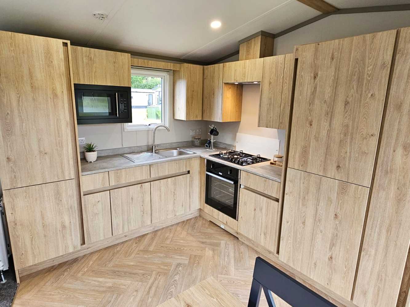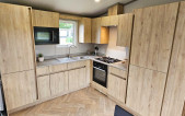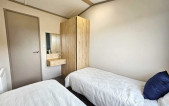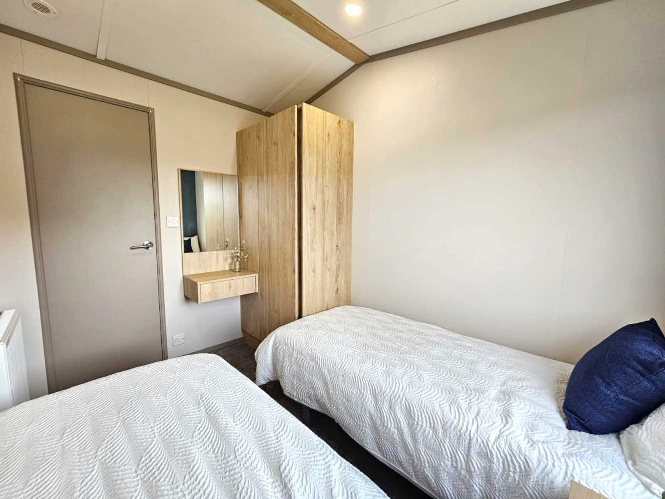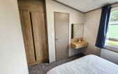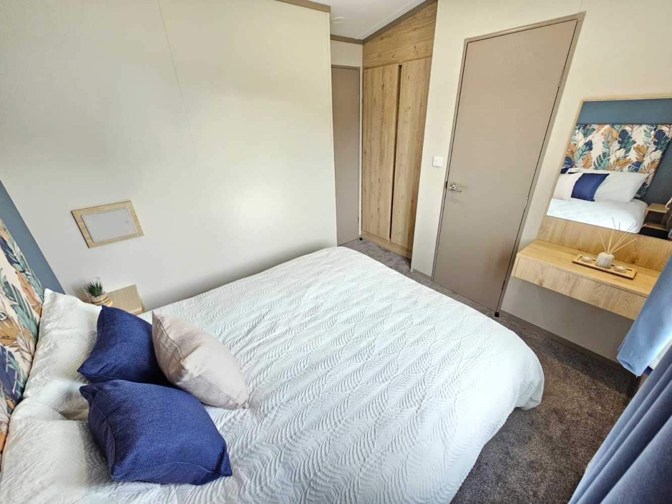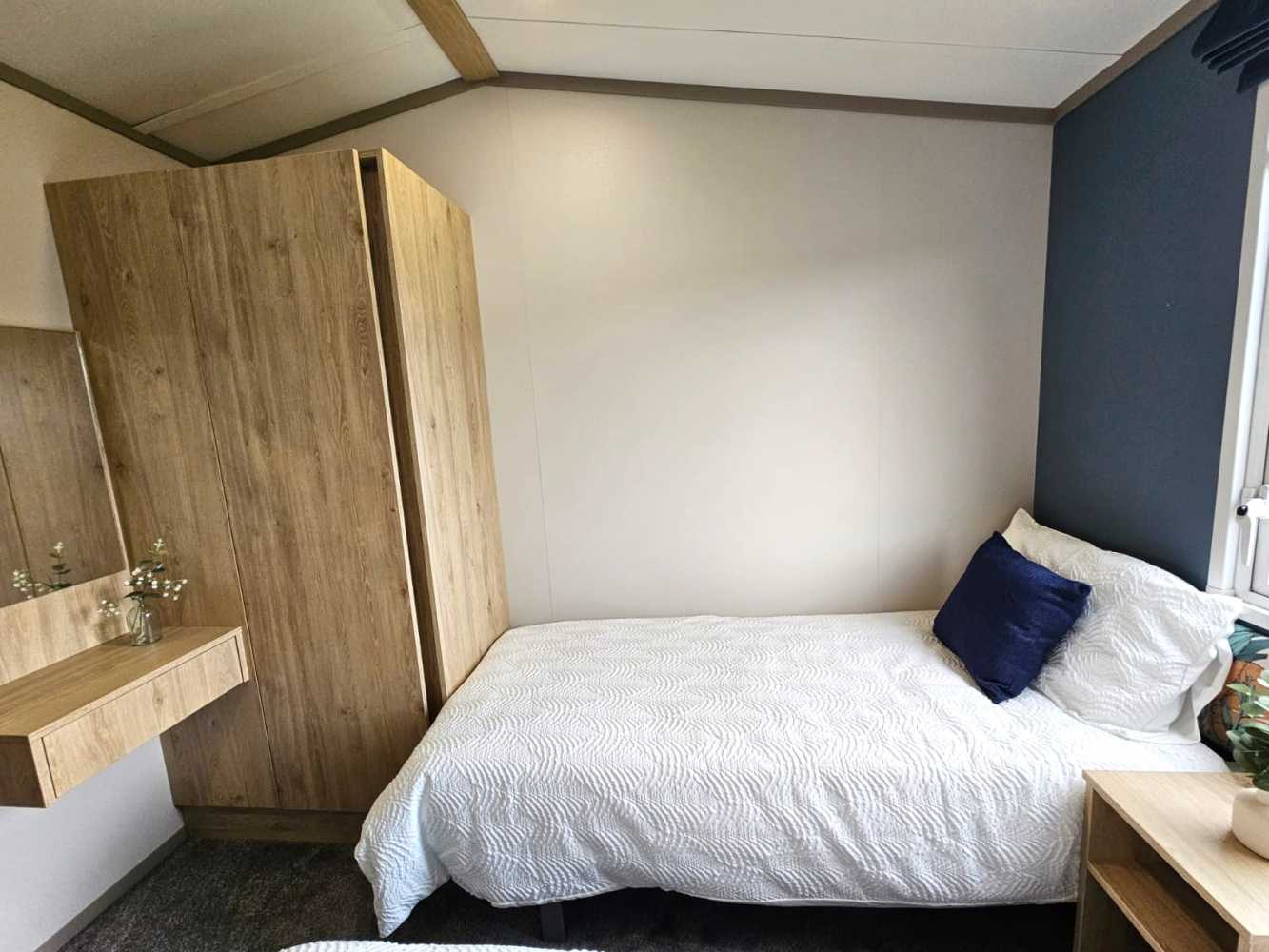 The Victory Baywood is an ideal choice for families and first-time holiday home buyers looking to escape the everyday. The living room features a spacious L-shaped sofa, coffee table, and TV unit, all bathed in natural light from the large front windows. The kitchen is equipped with a 4-burner gas hob, gas oven/grill, integrated fridge/freezer, and microwave, all set on modern, easy-to-clean herringbone flooring. A free-standing dining table and chairs provide seating for four, perfect for family meals or entertaining guests. The master bedroom boasts a stylish patterned headboard, ample vanity unit with drawer and mirror, as well as an en-suite WC and hand basin for added convenience. The twin bedroom includes a fitted wardrobe and compact vanity unit with drawer and mirror, ensuring plenty of storage space for guests. For additional sleeping arrangements, an air bed with an electric pump is available to accommodate extra guests comfortably. The bathroom is bright and airy, featuring a shower, WC, and hand basin, providing all the necessary amenities for a relaxing stay. Overall, the Victory Baywood offers a comfortable and stylish retreat for those seeking a peaceful holiday home getaway.