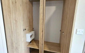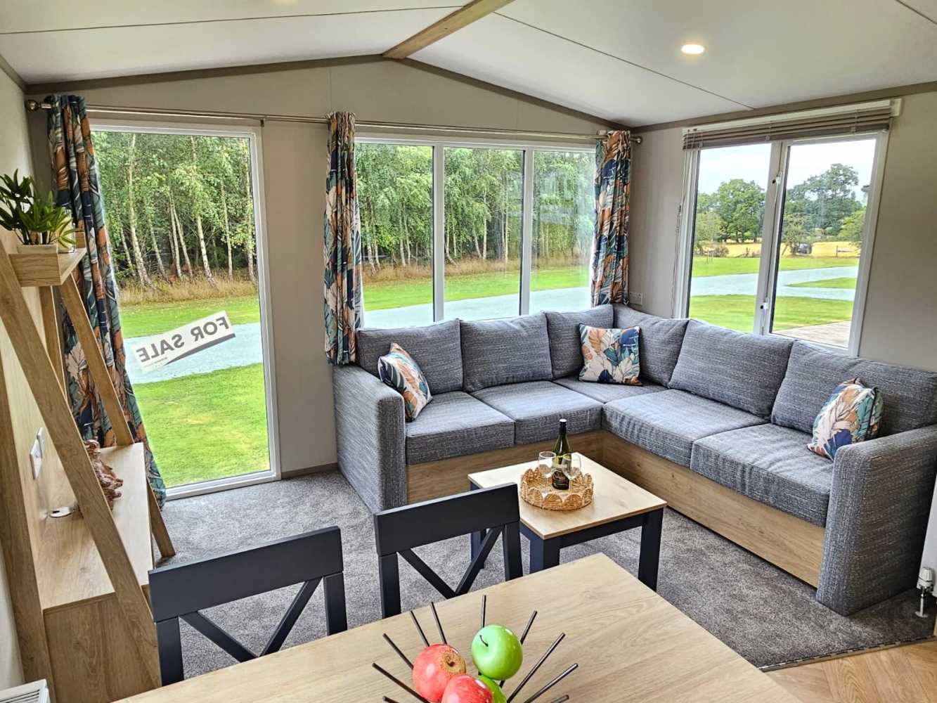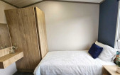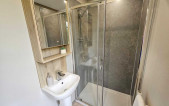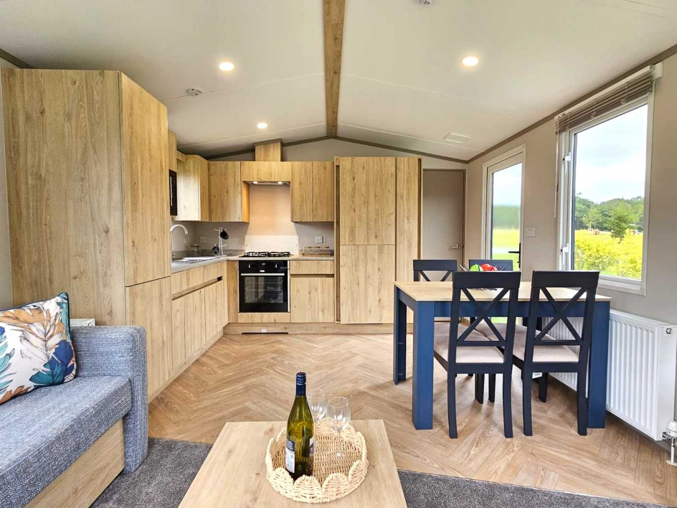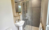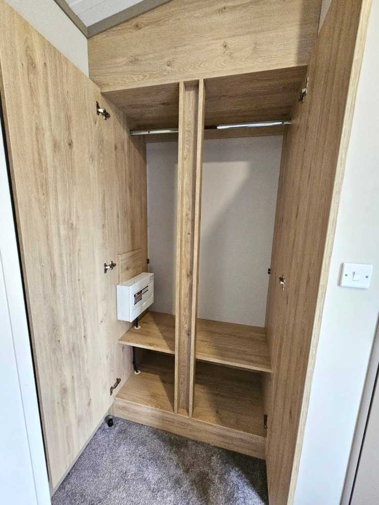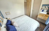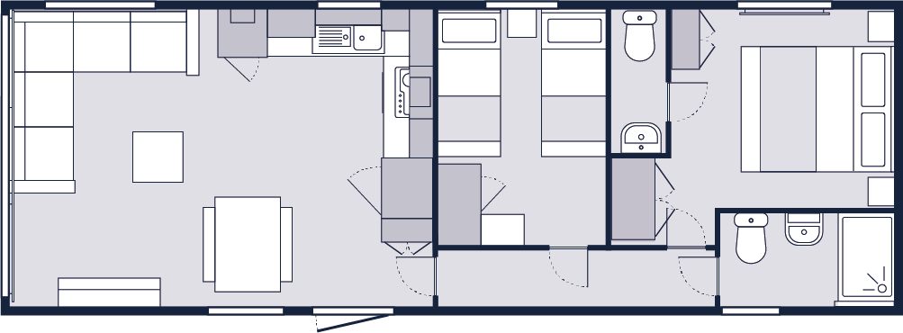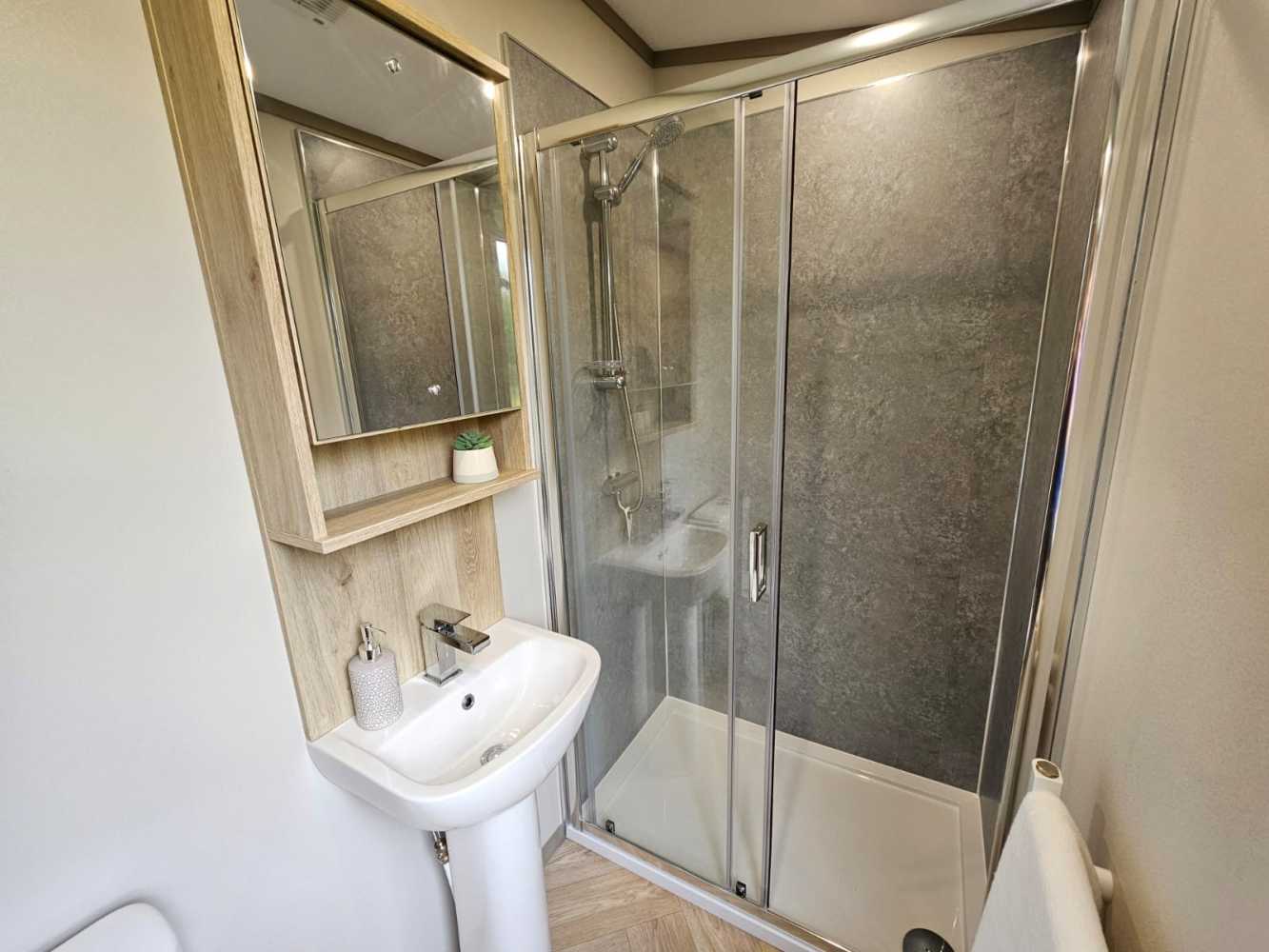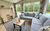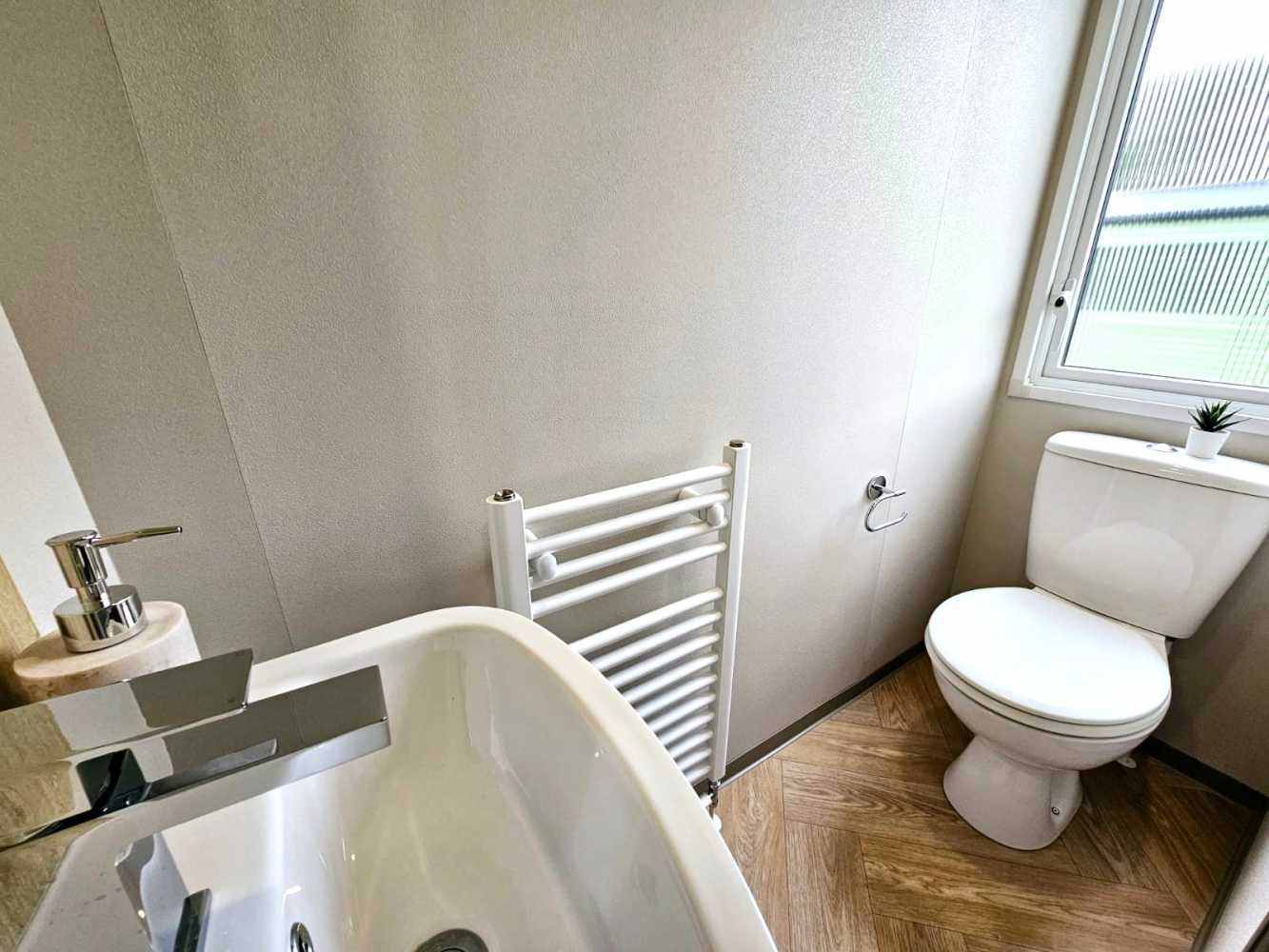 The Victory Baywood is an ideal choice for families and first-time holiday home buyers looking to escape the everyday. The living room features a spacious L-shaped sofa, coffee table, and TV unit, all bathed in natural light from the large front windows. The kitchen is equipped with a 4-burner gas hob, gas oven/grill, integrated fridge/freezer, and microwave, all set on modern, easy-to-clean herringbone flooring. A free-standing dining table and chairs provide seating for four, perfect for family meals or entertaining guests. The master bedroom boasts a stylish patterned headboard, ample vanity unit with drawer and mirror, as well as an en-suite WC and hand basin for added convenience. The twin bedroom includes a fitted wardrobe and compact vanity unit with drawer and mirror, ensuring plenty of storage space for guests. For additional sleeping arrangements, an air bed with an electric pump is available to accommodate extra guests comfortably. The bathroom is bright and airy, featuring a shower, WC, and hand basin, providing all the necessary amenities for a relaxing stay. Overall, the Victory Baywood offers a comfortable and stylish retreat for those seeking a peaceful holiday home getaway.