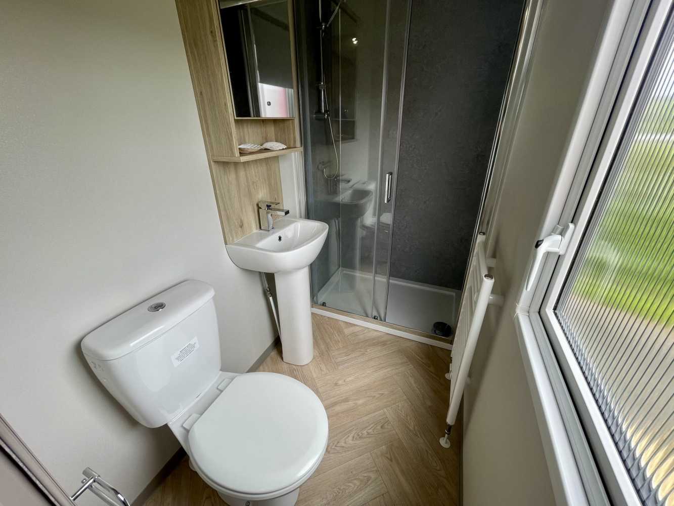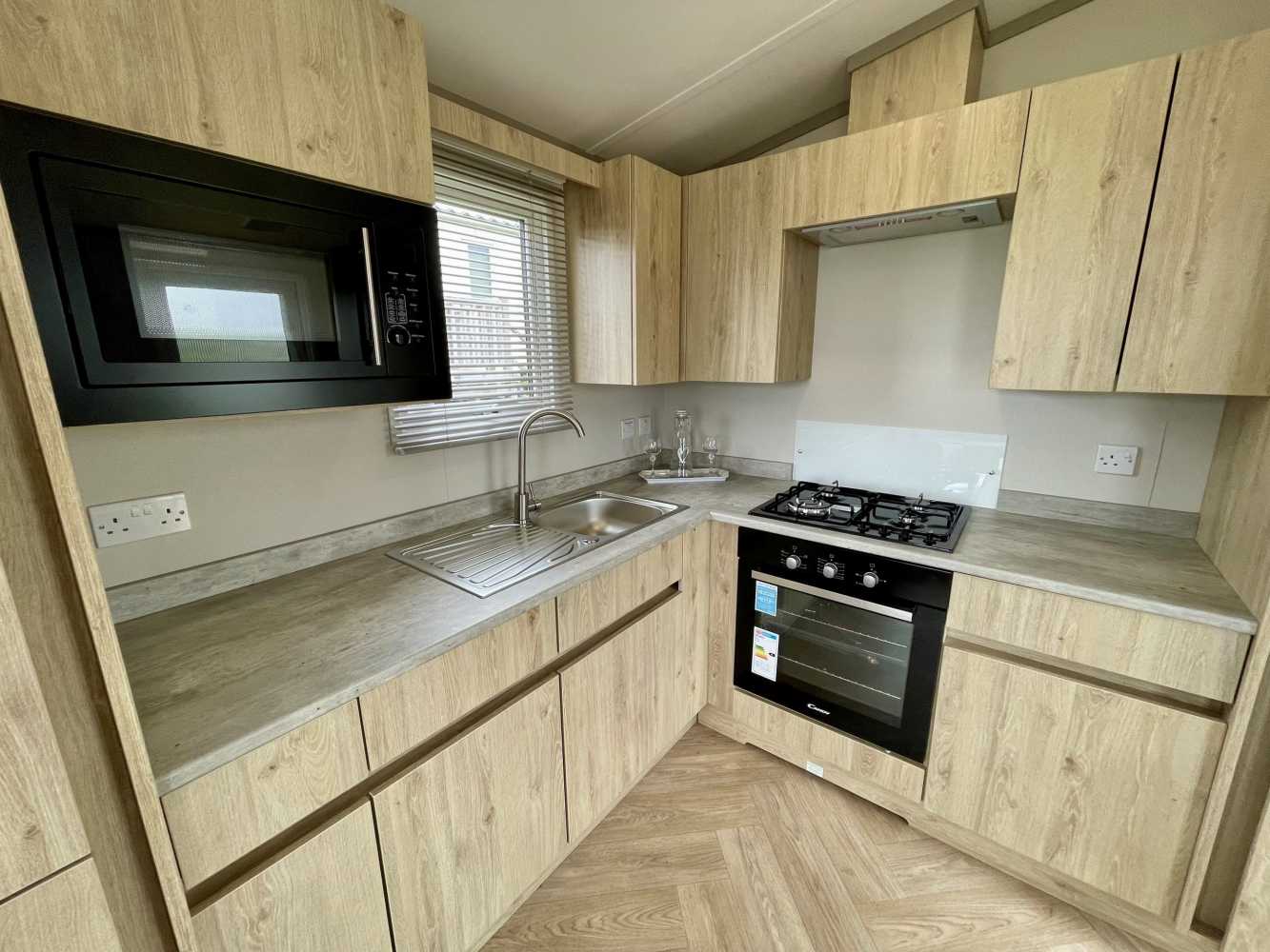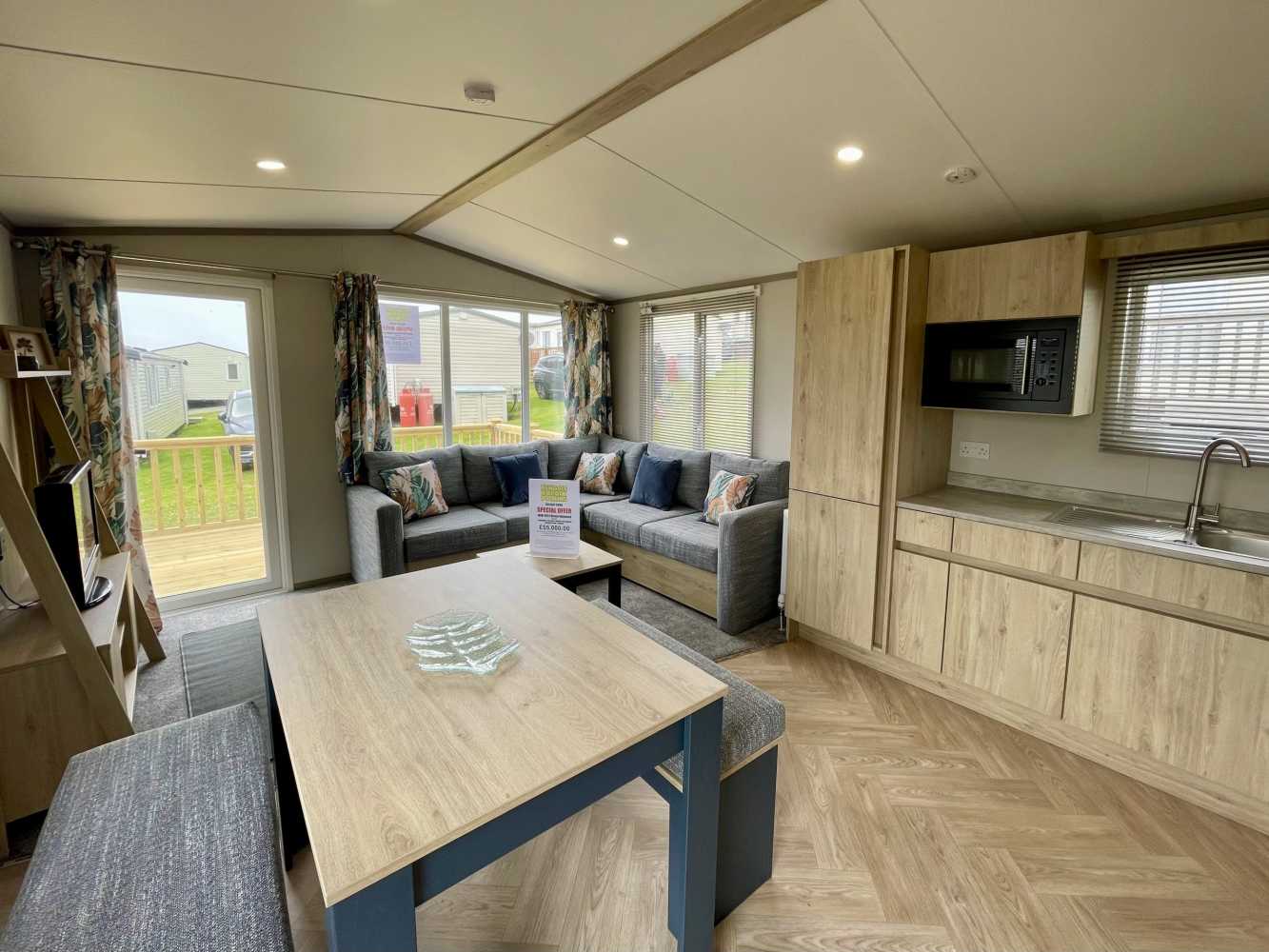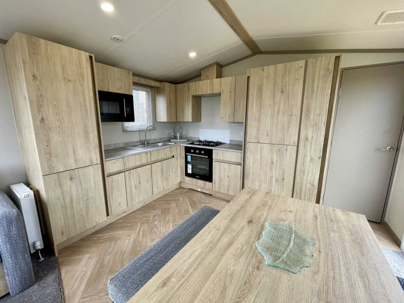 This brand new Victory Baywood is for sale on Plot 26 at Newgale Coast Holiday Park. Quite literally a stones throw away from one of Pembrokeshire’s most loved locations, Newgale Beach. The Baywood is a cozy and inviting base for exploring the beautiful Pembrokeshire Coast and also a great hideaway for those weekends you just need to escape from the everyday routine and staycation in style. Our favourite features... - The spacious living space is perfect for unwinding and making memories with the family. The vibrant tropical fabrics combined with navy and rust hues add a warming Scandi vibe whilst also being hardwearing, so you don’t have to worry about the kid’s sticky hands or dog’s muddy paws. You can simply sit back, switch off and enjoy your holiday home. - The kitchen lends itself to busy family mealtimes, with plenty of worktop space to whip up a full English or a brunchtime snack. The modern herringbone flooring is easy to clean and included is a fridge/freezer and a dining table that fits the whole family. - The bathroom offers plenty of natural light and the concrete-effect wet wall is bang on trend so you can shower in style. Privacy is maintained with the venetian blind and the same great styling is carried through into the ensuite. So after a long day at the beach, you can wash away the sand in between your toes and settle down for a cosy night in. - The tropical vibes carry on into the bedrooms with matching floral fabric headboards. The master bedroom includes an ensuite and plenty of wardrobe storage. The second twin bedroom is extra roomy and also includes great storage. - We’ve had a brand new hardwood decking built on Plot 26 to make the most of its stunning sea views. Easily step out onto the front decking from the living room door to watch unlimited sunsets over Newgale Beach. – You wont ever get bored of them!