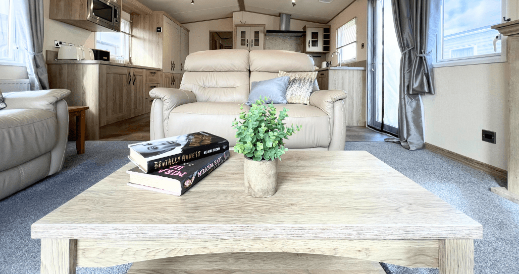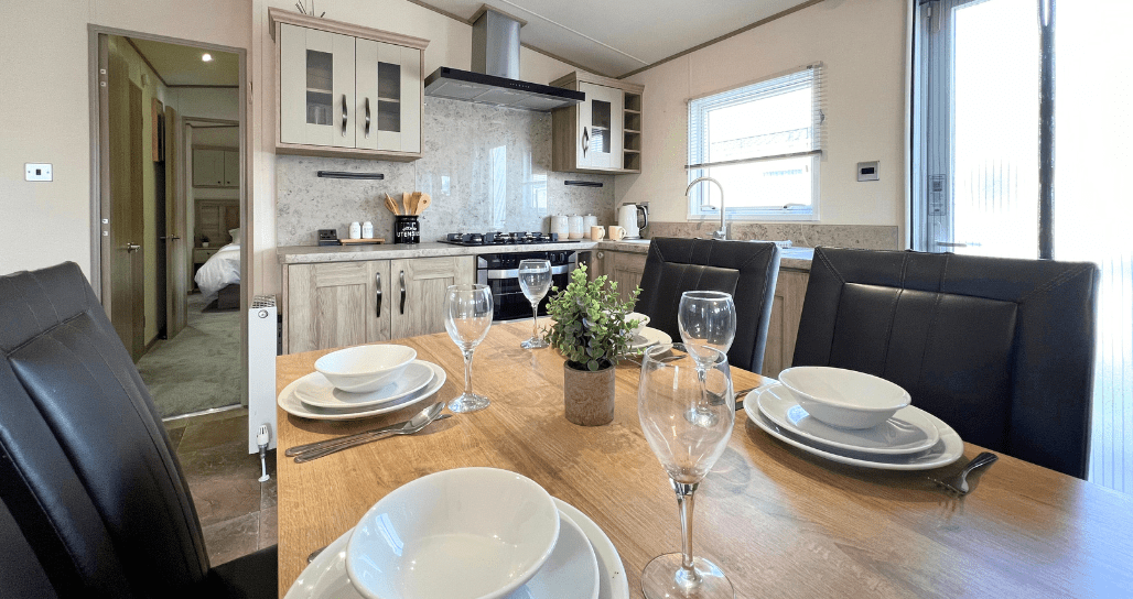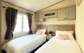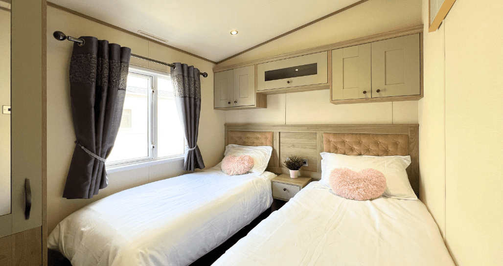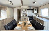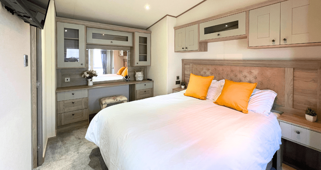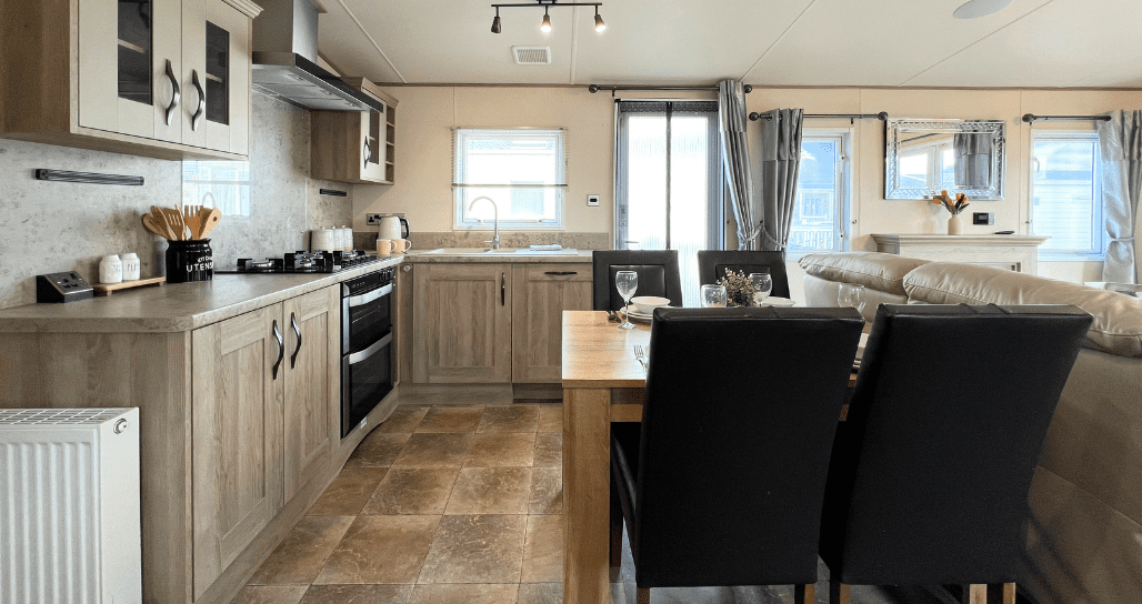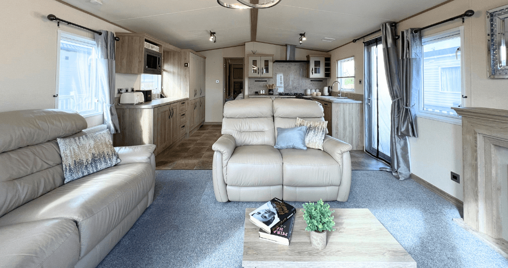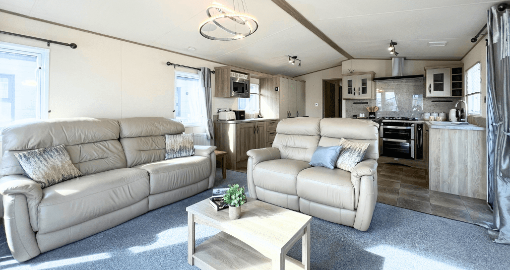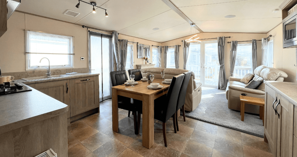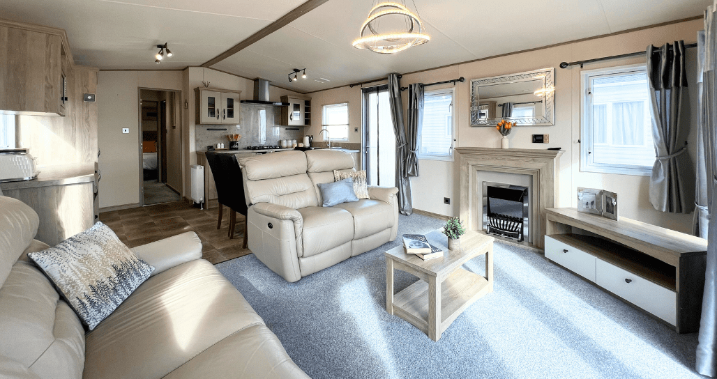 Step inside the ABI Beaumont static caravan and experience true elegance, space, and luxury. Designed as one of ABI’s flagship holiday homes, the Beaumont combines high-quality craftsmanship with thoughtful touches that make it stand out as the ultimate in holiday home ownership. This luxury caravan is beautifully open-plan, starting with a spacious kitchen perfect for cooking, dining, and entertaining. Finished in light lime-washed wood, the kitchen offers generous storage, a modern oven and hob, built-in appliances, and a handy pantry. A matching dining set with four black faux-leather chairs creates a welcoming space for family meals or hosting guests. Why cook when you can relax? Guy’s Bar & Restaurant has had a fresh makeover in the newly refurbished The Country Club, Click here to come see what’s new and check out the menu! The open-plan layout flows into a bright, spacious living area. Here you’ll find a two leather sofas, freestanding wood furniture, and a striking feature fireplace. Elegant drop lighting, a bold wall mirror, and silver curtains on pewter rails add a sophisticated touch. This living room offers the perfect place to relax with family or entertain friends in style. The ABI Beaumont caravan boasts two generously sized bedrooms, comfortably sleeping four. The master suite is a true highlight, featuring a central bed with a statement button-back headboard, bedside tables, overhead storage, and a dedicated dressing area. Beyond this, a walk-in wardrobe leads into a stylish en-suite with a full-sized bath and shower, a rare luxury in static caravans. The second bedroom is designed as a versatile twin, complete with two single beds, upholstered headboards, ample storage, and a dressing area with mirror. A contemporary family bathroom with a modern shower and sleek shelving completes the layout. With its spacious interiors, high-end finishes, and thoughtful design, it’s the perfect choice for those who want more than just a static caravan, they want a lifestyle. The ABI Beaumont: luxury holiday living, redefined.