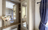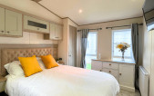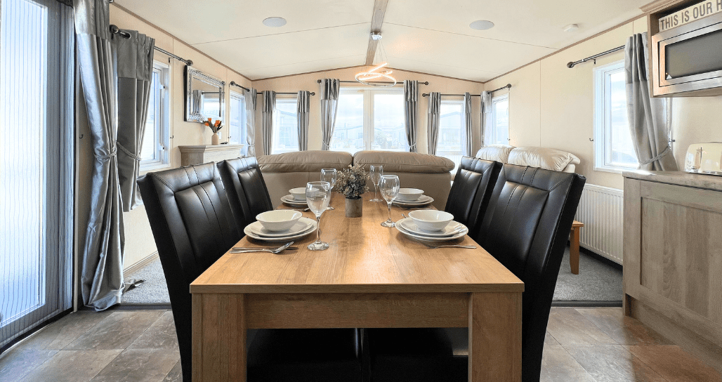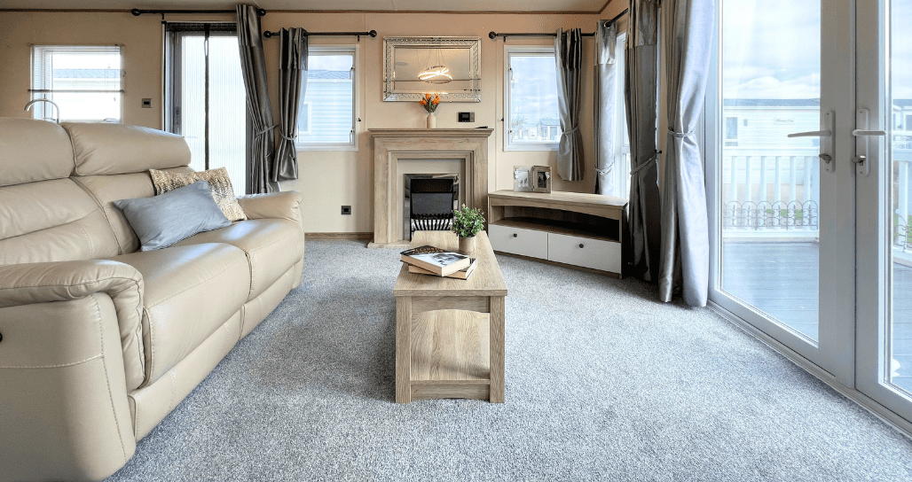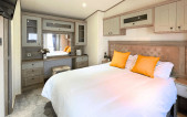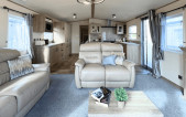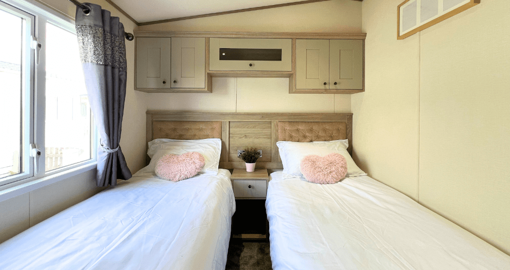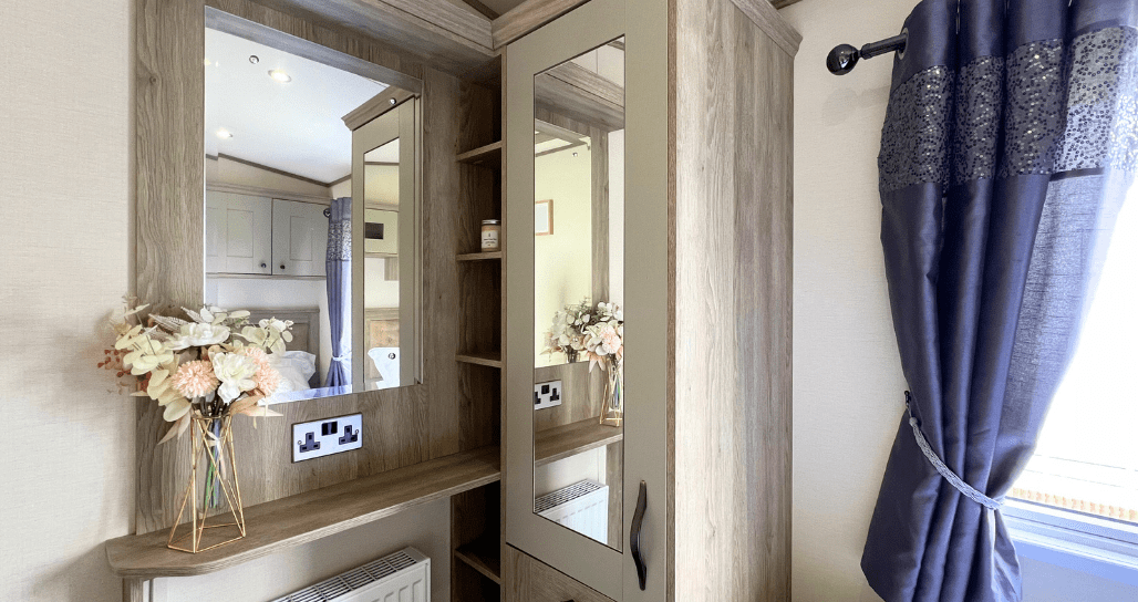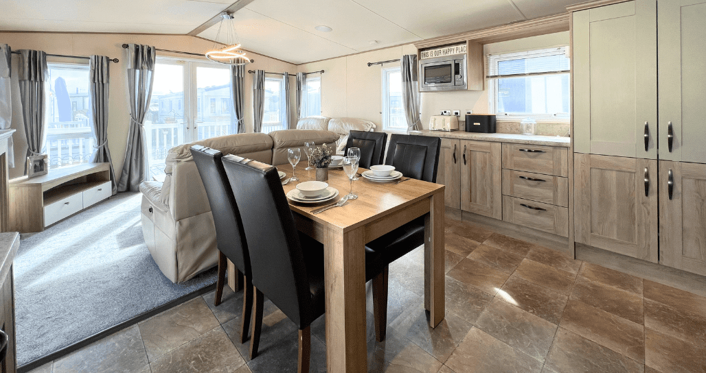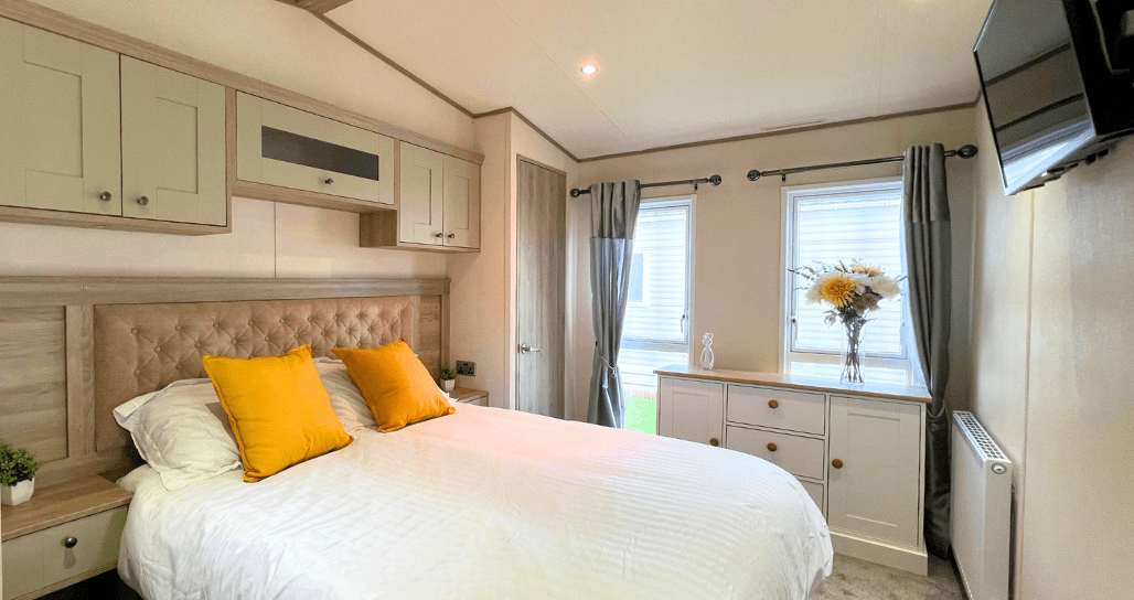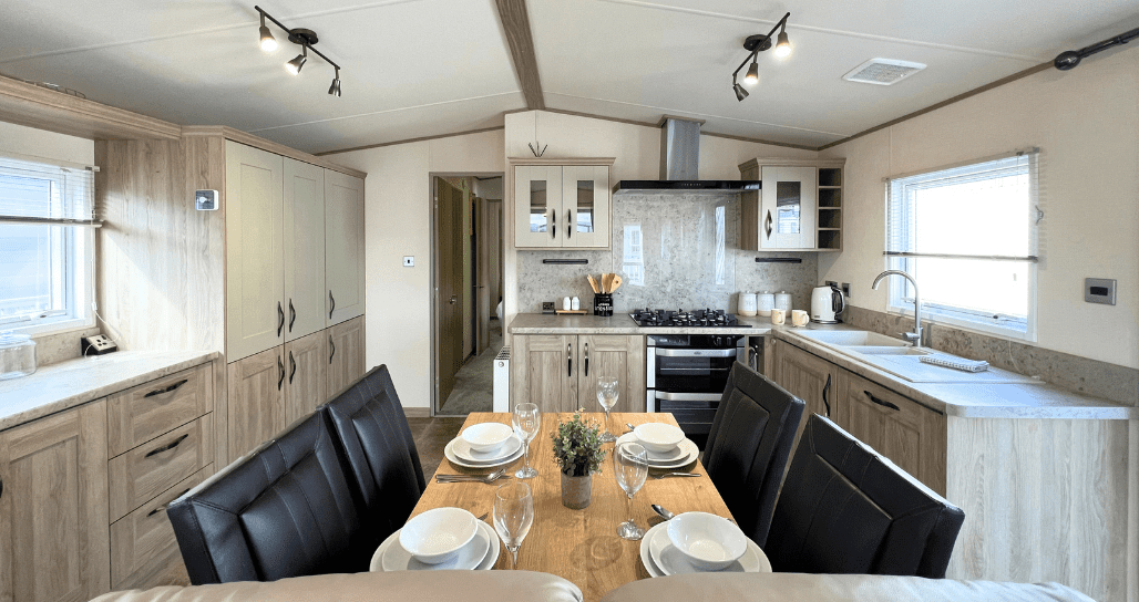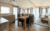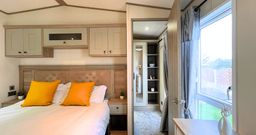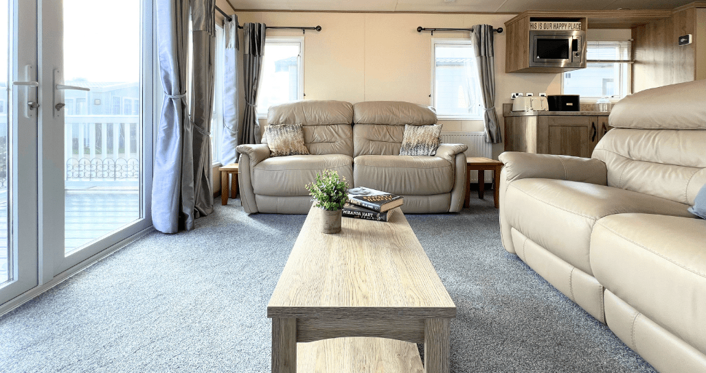 Step inside the ABI Beaumont static caravan and experience true elegance, space, and luxury. Designed as one of ABI’s flagship holiday homes, the Beaumont combines high-quality craftsmanship with thoughtful touches that make it stand out as the ultimate in holiday home ownership. This luxury caravan is beautifully open-plan, starting with a spacious kitchen perfect for cooking, dining, and entertaining. Finished in light lime-washed wood, the kitchen offers generous storage, a modern oven and hob, built-in appliances, and a handy pantry. A matching dining set with four black faux-leather chairs creates a welcoming space for family meals or hosting guests. Why cook when you can relax? Guy’s Bar & Restaurant has had a fresh makeover in the newly refurbished The Country Club, Click here to come see what’s new and check out the menu! The open-plan layout flows into a bright, spacious living area. Here you’ll find a two leather sofas, freestanding wood furniture, and a striking feature fireplace. Elegant drop lighting, a bold wall mirror, and silver curtains on pewter rails add a sophisticated touch. This living room offers the perfect place to relax with family or entertain friends in style. The ABI Beaumont caravan boasts two generously sized bedrooms, comfortably sleeping four. The master suite is a true highlight, featuring a central bed with a statement button-back headboard, bedside tables, overhead storage, and a dedicated dressing area. Beyond this, a walk-in wardrobe leads into a stylish en-suite with a full-sized bath and shower, a rare luxury in static caravans. The second bedroom is designed as a versatile twin, complete with two single beds, upholstered headboards, ample storage, and a dressing area with mirror. A contemporary family bathroom with a modern shower and sleek shelving completes the layout. With its spacious interiors, high-end finishes, and thoughtful design, it’s the perfect choice for those who want more than just a static caravan, they want a lifestyle. The ABI Beaumont: luxury holiday living, redefined.
