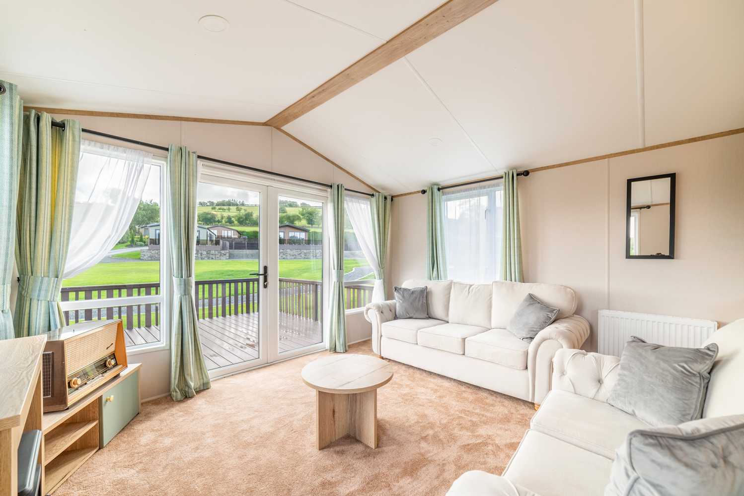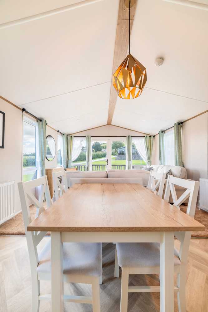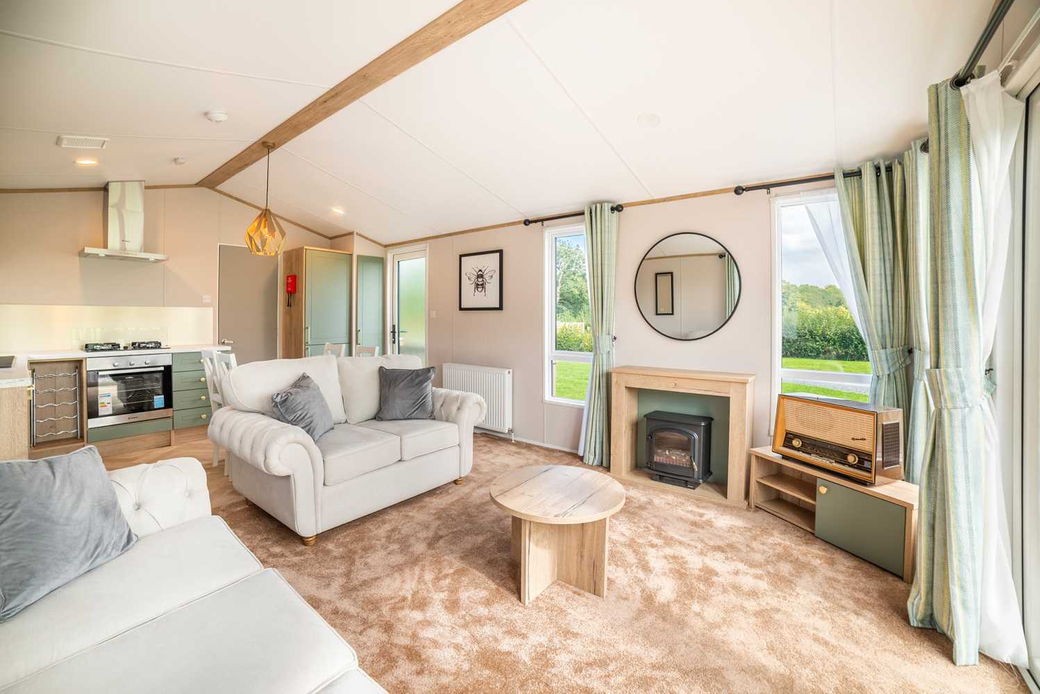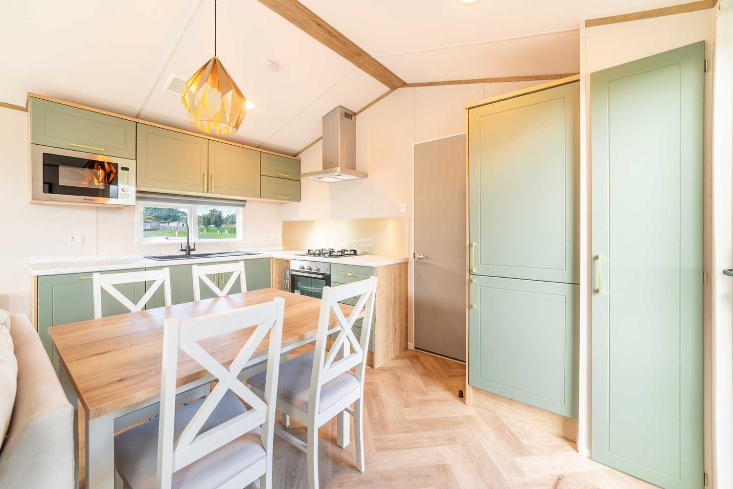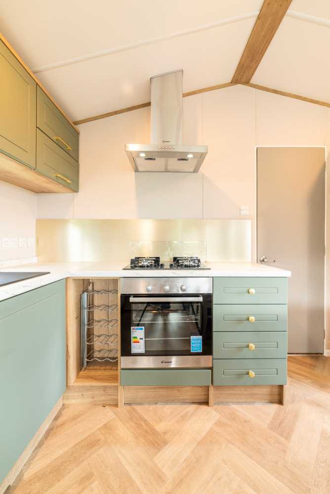 This pre-owned Atlas Heritage sits on a stunning plot on the edge of the Retreat development at Rockbridge Country Holiday Park. The views can be taken advantage of from the larger than average front decking. There’s bags of room here for patio furniture giving you a gorgeous outside space to enjoy. You enter the Heritage through the obscure glazed side door and you’re straight into the fully fitted kitchen. The kitchen cupboards are in a contemporary olive green with white marble effect worktops over. There’s an integrated fridge/freezer, microwave and dishwasher. The bowl and half sink is in sleek matt black and the four ring gas hob with cooker under has a stainless-steel backsplash. A light oak dining table seats 4 but would easily accommodate more. There’s a handy full length storage cupboard – ideal for the ironing board, and a built-in wine rack – ideal for……wine. The home has recently been carpeted throughout, and the lounge is light and airy with patio doors and long line windows on two sides. There’s a 2 and 3- seater sofa, one of which is a sofa bed – handy for visitors. At the back end of the home are the bedrooms and bathroom. The guest bedroom has twin beds and a wardrobe. Just opposite is the family shower room with a double shower tray with sliding doors, white suite, obscured window and plenty of storage. The master bedroom has 2 long line windows bringing in plenty of light. There’s an ensuite WC, dressing table with mirror and large wardrobe. All in all, a brilliant holiday home in a fabulous location