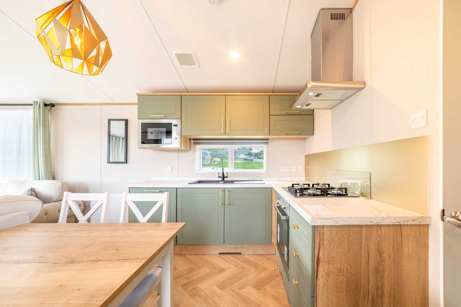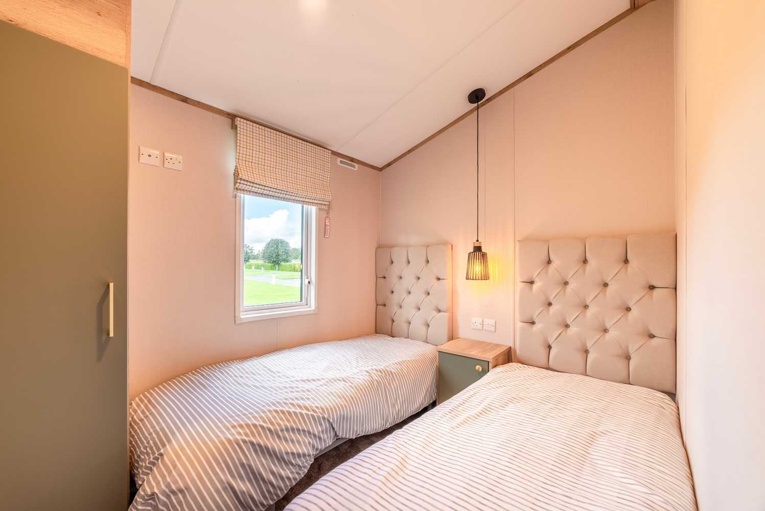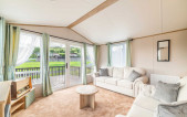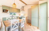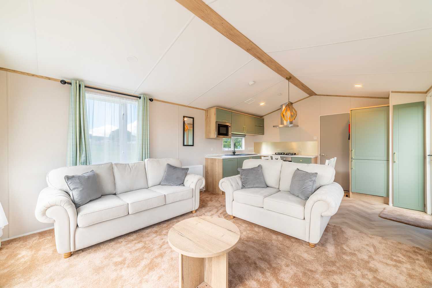 This pre-owned Atlas Heritage sits on a stunning plot on the edge of the Retreat development at Rockbridge Country Holiday Park. The views can be taken advantage of from the larger than average front decking. There’s bags of room here for patio furniture giving you a gorgeous outside space to enjoy. You enter the Heritage through the obscure glazed side door and you’re straight into the fully fitted kitchen. The kitchen cupboards are in a contemporary olive green with white marble effect worktops over. There’s an integrated fridge/freezer, microwave and dishwasher. The bowl and half sink is in sleek matt black and the four ring gas hob with cooker under has a stainless-steel backsplash. A light oak dining table seats 4 but would easily accommodate more. There’s a handy full length storage cupboard – ideal for the ironing board, and a built-in wine rack – ideal for……wine. The home has recently been carpeted throughout, and the lounge is light and airy with patio doors and long line windows on two sides. There’s a 2 and 3- seater sofa, one of which is a sofa bed – handy for visitors. At the back end of the home are the bedrooms and bathroom. The guest bedroom has twin beds and a wardrobe. Just opposite is the family shower room with a double shower tray with sliding doors, white suite, obscured window and plenty of storage. The master bedroom has 2 long line windows bringing in plenty of light. There’s an ensuite WC, dressing table with mirror and large wardrobe. All in all, a brilliant holiday home in a fabulous location