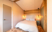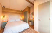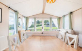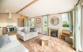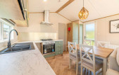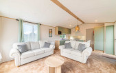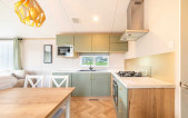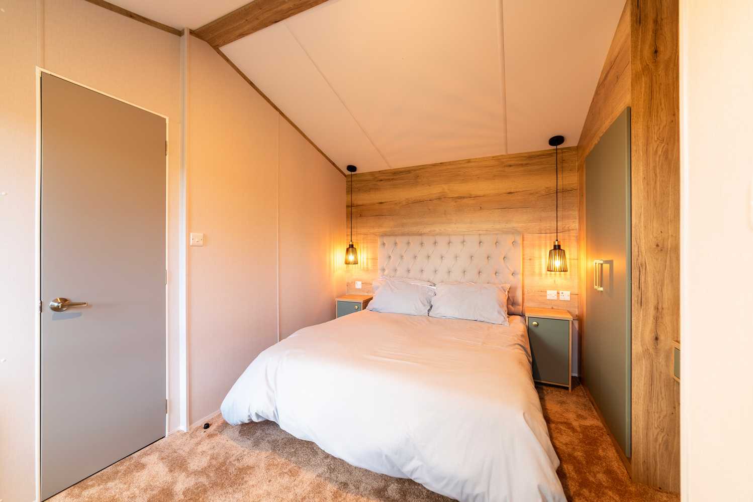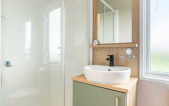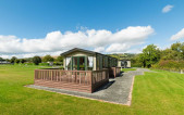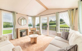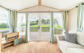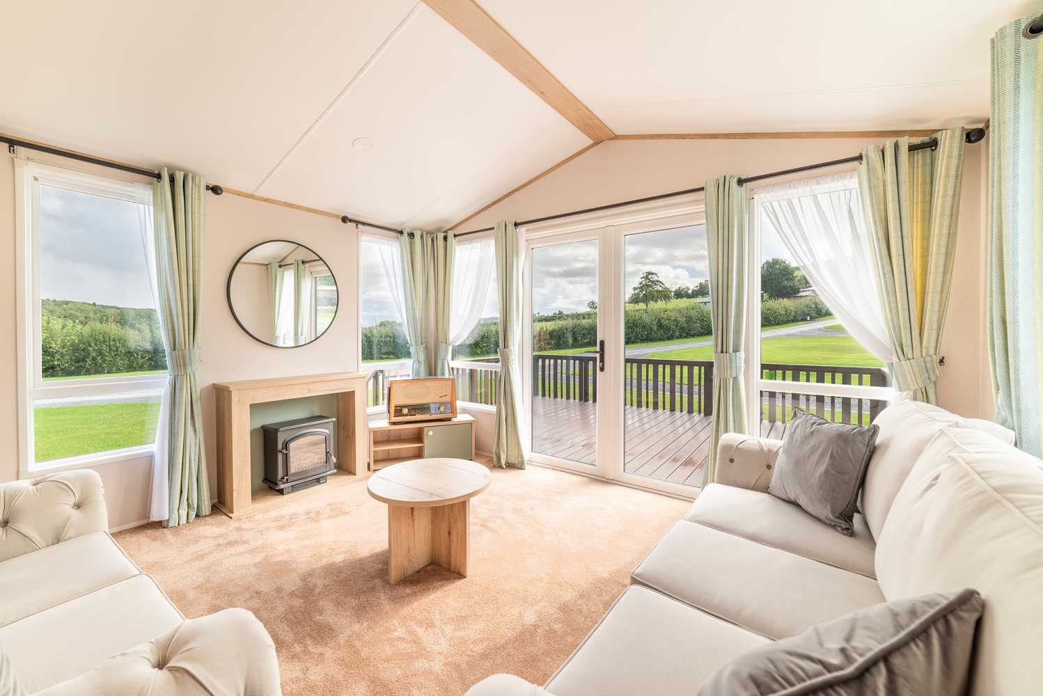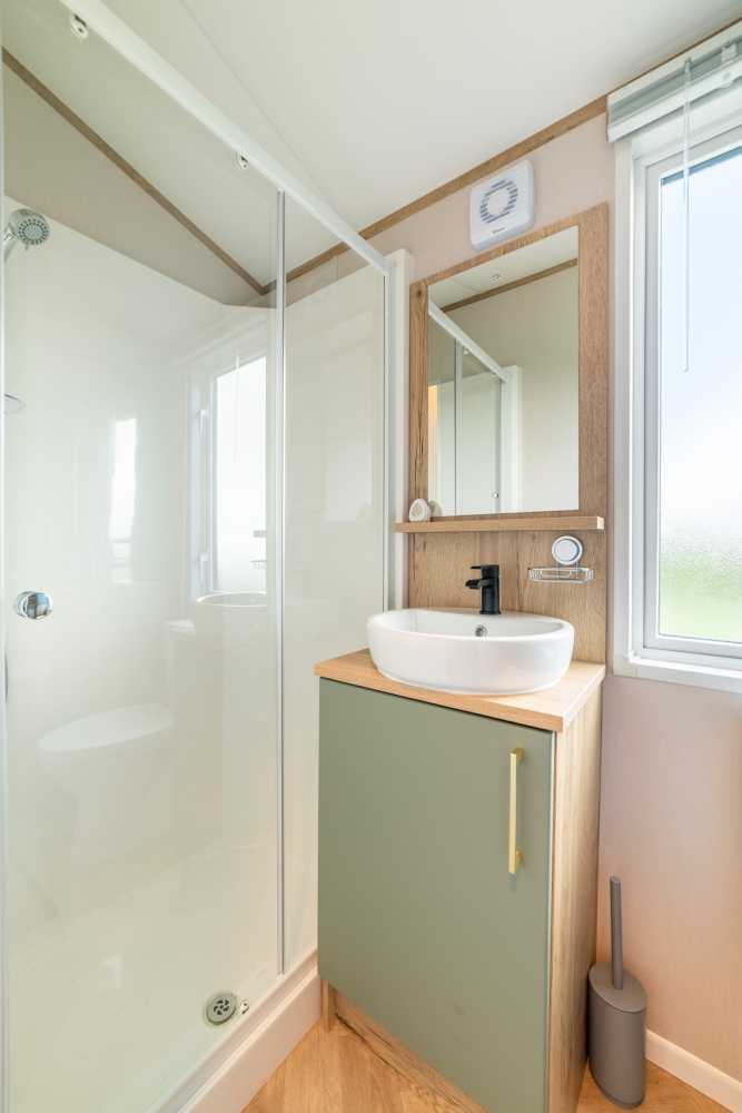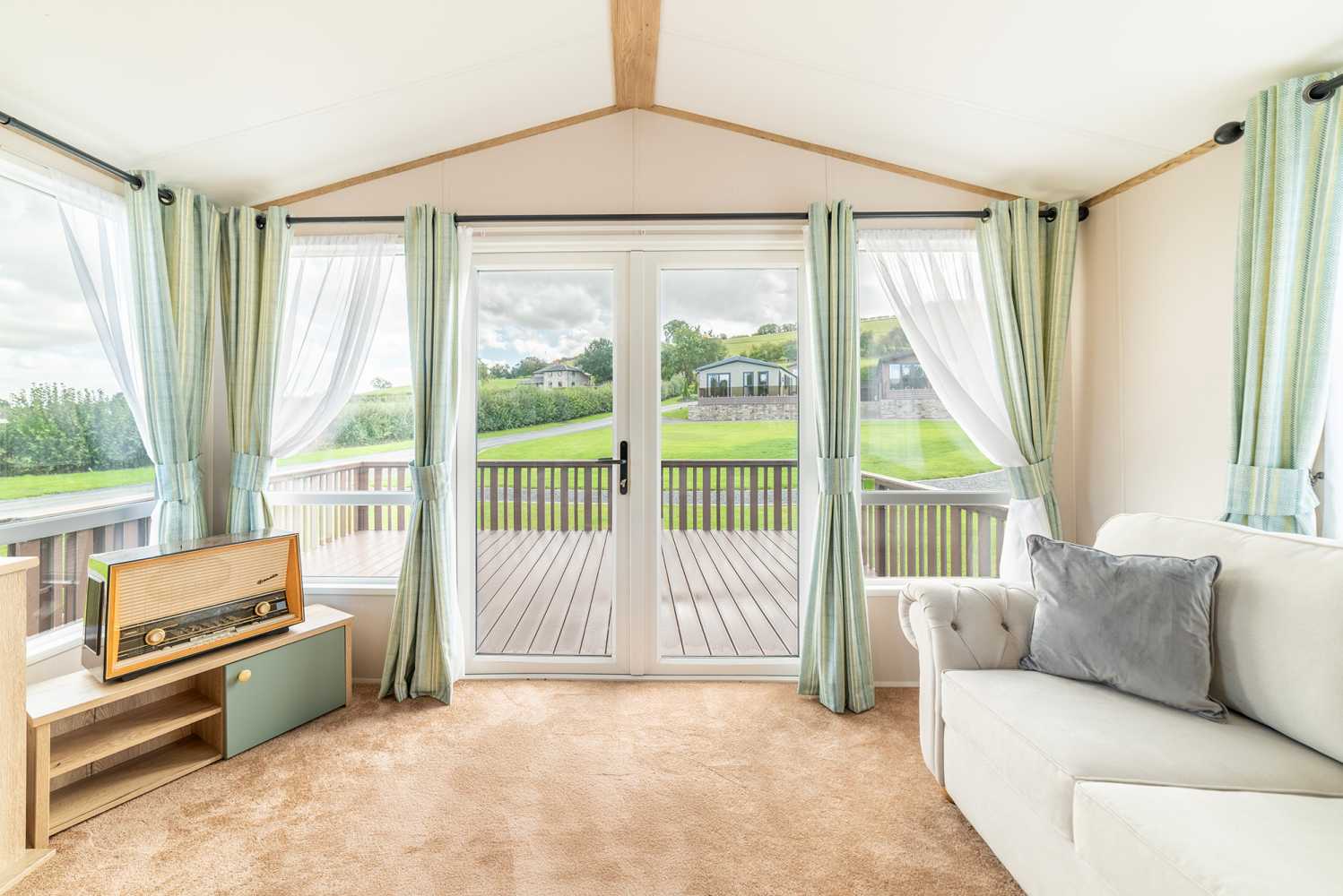 This pre-owned Atlas Heritage sits on a stunning plot on the edge of the Retreat development at Rockbridge Country Holiday Park. The views can be taken advantage of from the larger than average front decking. There’s bags of room here for patio furniture giving you a gorgeous outside space to enjoy. You enter the Heritage through the obscure glazed side door and you’re straight into the fully fitted kitchen. The kitchen cupboards are in a contemporary olive green with white marble effect worktops over. There’s an integrated fridge/freezer, microwave and dishwasher. The bowl and half sink is in sleek matt black and the four ring gas hob with cooker under has a stainless-steel backsplash. A light oak dining table seats 4 but would easily accommodate more. There’s a handy full length storage cupboard – ideal for the ironing board, and a built-in wine rack – ideal for……wine. The home has recently been carpeted throughout, and the lounge is light and airy with patio doors and long line windows on two sides. There’s a 2 and 3- seater sofa, one of which is a sofa bed – handy for visitors. At the back end of the home are the bedrooms and bathroom. The guest bedroom has twin beds and a wardrobe. Just opposite is the family shower room with a double shower tray with sliding doors, white suite, obscured window and plenty of storage. The master bedroom has 2 long line windows bringing in plenty of light. There’s an ensuite WC, dressing table with mirror and large wardrobe. All in all, a brilliant holiday home in a fabulous location