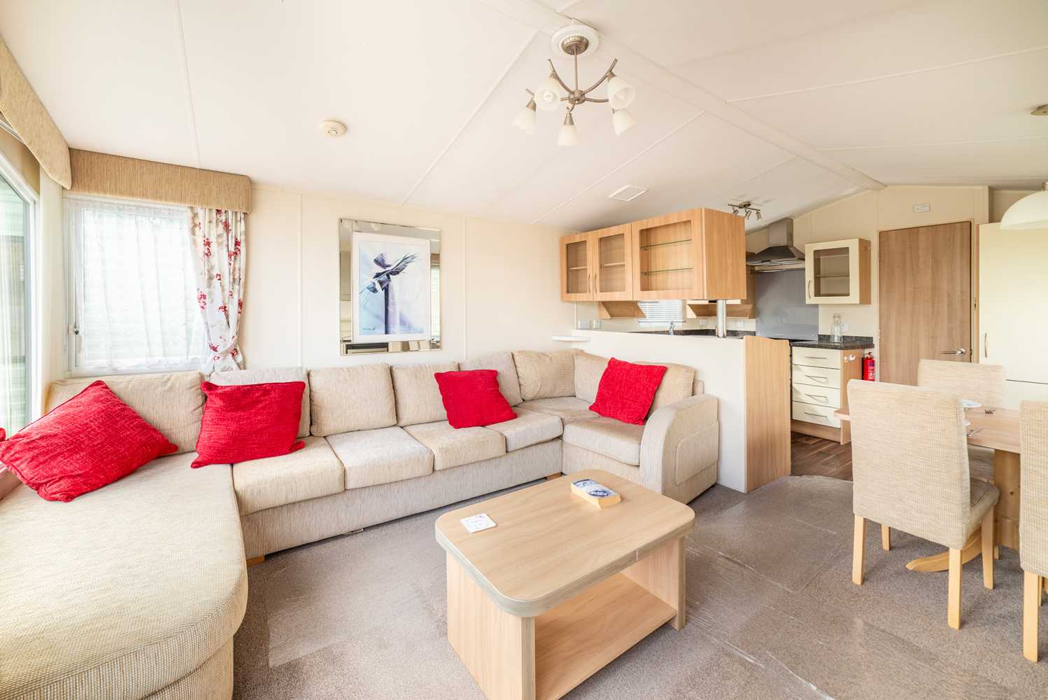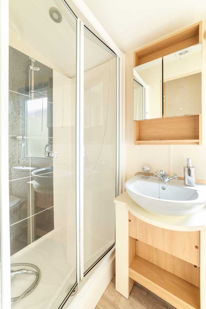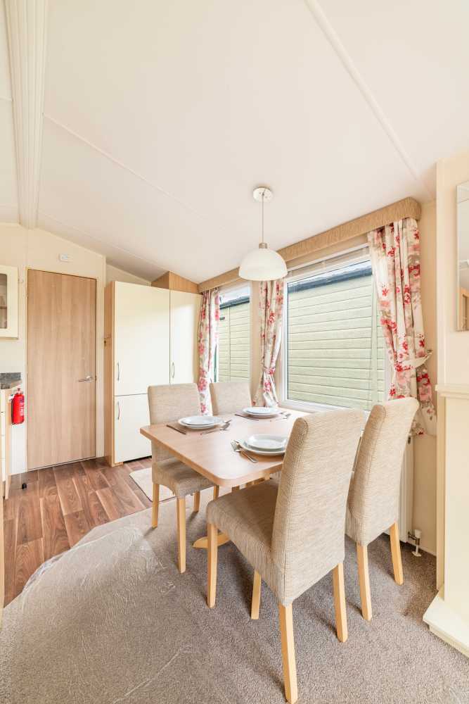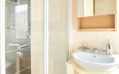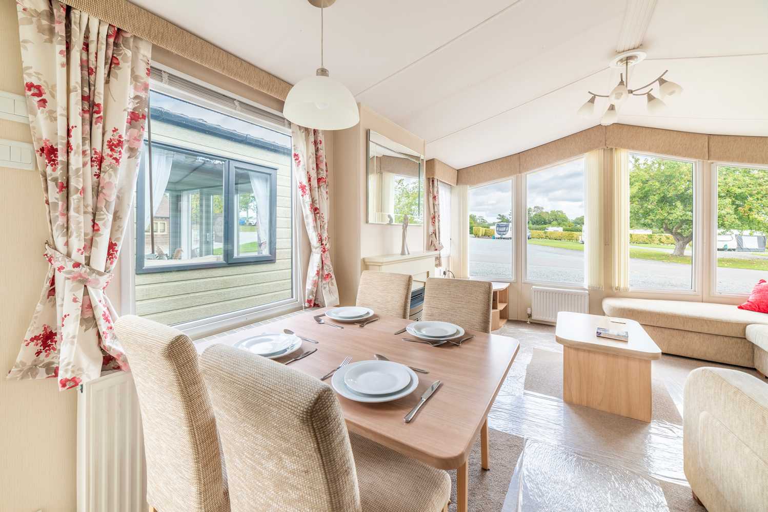 This Willerby Newhampton is a fantastic entry level holiday home currently on our sales ground at Arrow Bank but with a choice of 2 plots on park if you become the lucky owner. Once you enter the Newhampton from the door at the side that brings you directly into the kitchen, you won’t fail to notice the level of light in the open plan sitting room. A key feature of the Newhampton are the large front windows that stretch the entire width of the home – bringing in vast amounts of light throughout the living area. There’s a large corner sofa that doubles as sofa bed, plenty of room for a big TV and a dining table with upholstered chairs that seats 4. The horseshoe kitchen has bags of cupboard space above and below the granite effect worktops. There’s an integral fridge freezer and a useful full-length utility cupboard. The kitchen benefits from the light flooding in from the entrance door and double aspect windows. The 2 bedrooms are served by a generous family shower room, whilst the master bedroom has an en-suite WC. The 2nd bedroom has plenty of cupboard space and a wardrobe. The master bedroom is generous with cupboards over the bed and drawer units to both sides. There are mirror fronted wardrobes with drawers under to ensure you’ll never be short of storage.