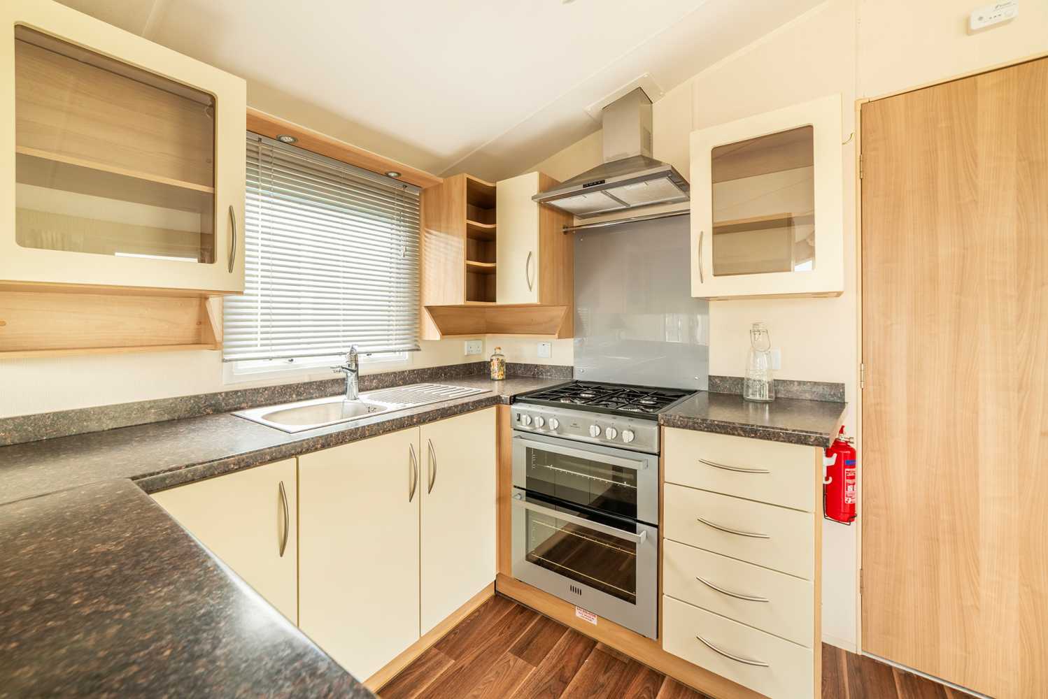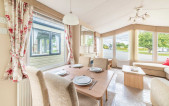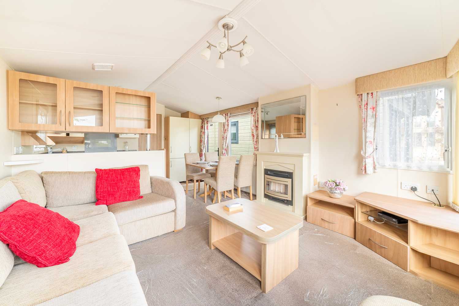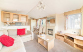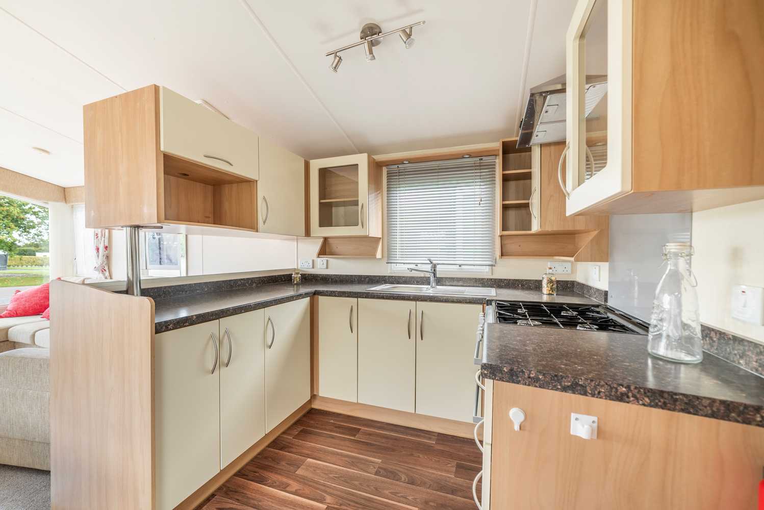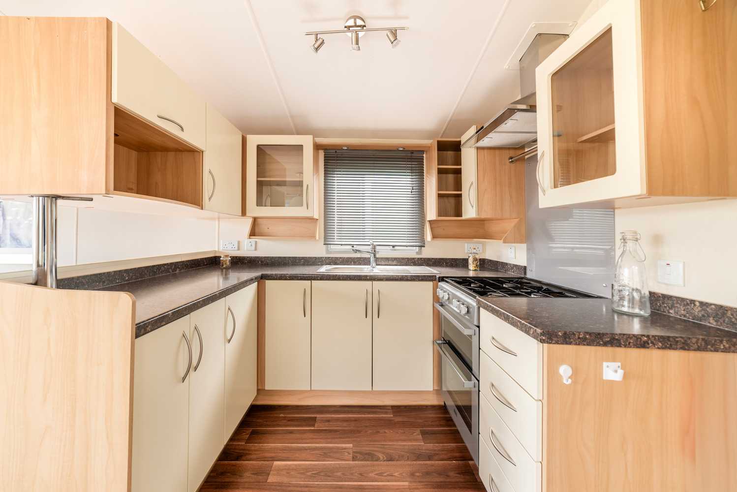 This Willerby Newhampton is a fantastic entry level holiday home currently on our sales ground at Arrow Bank but with a choice of 2 plots on park if you become the lucky owner. Once you enter the Newhampton from the door at the side that brings you directly into the kitchen, you won’t fail to notice the level of light in the open plan sitting room. A key feature of the Newhampton are the large front windows that stretch the entire width of the home – bringing in vast amounts of light throughout the living area. There’s a large corner sofa that doubles as sofa bed, plenty of room for a big TV and a dining table with upholstered chairs that seats 4. The horseshoe kitchen has bags of cupboard space above and below the granite effect worktops. There’s an integral fridge freezer and a useful full-length utility cupboard. The kitchen benefits from the light flooding in from the entrance door and double aspect windows. The 2 bedrooms are served by a generous family shower room, whilst the master bedroom has an en-suite WC. The 2nd bedroom has plenty of cupboard space and a wardrobe. The master bedroom is generous with cupboards over the bed and drawer units to both sides. There are mirror fronted wardrobes with drawers under to ensure you’ll never be short of storage.