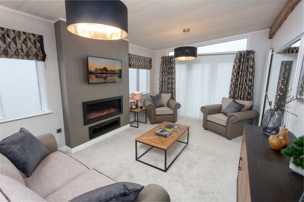 The Rivendale is a stunning 20ft Lodge by Pemberton Park & Leisure Homes. The true ‘lodge feel’ is achieved with the wood-effect accents, luxurious soft furnishings, and the recessed flame-effect fire. Premium features, such as the kitchen island, American-style fridge-freezer and integrated appliances come as standard.