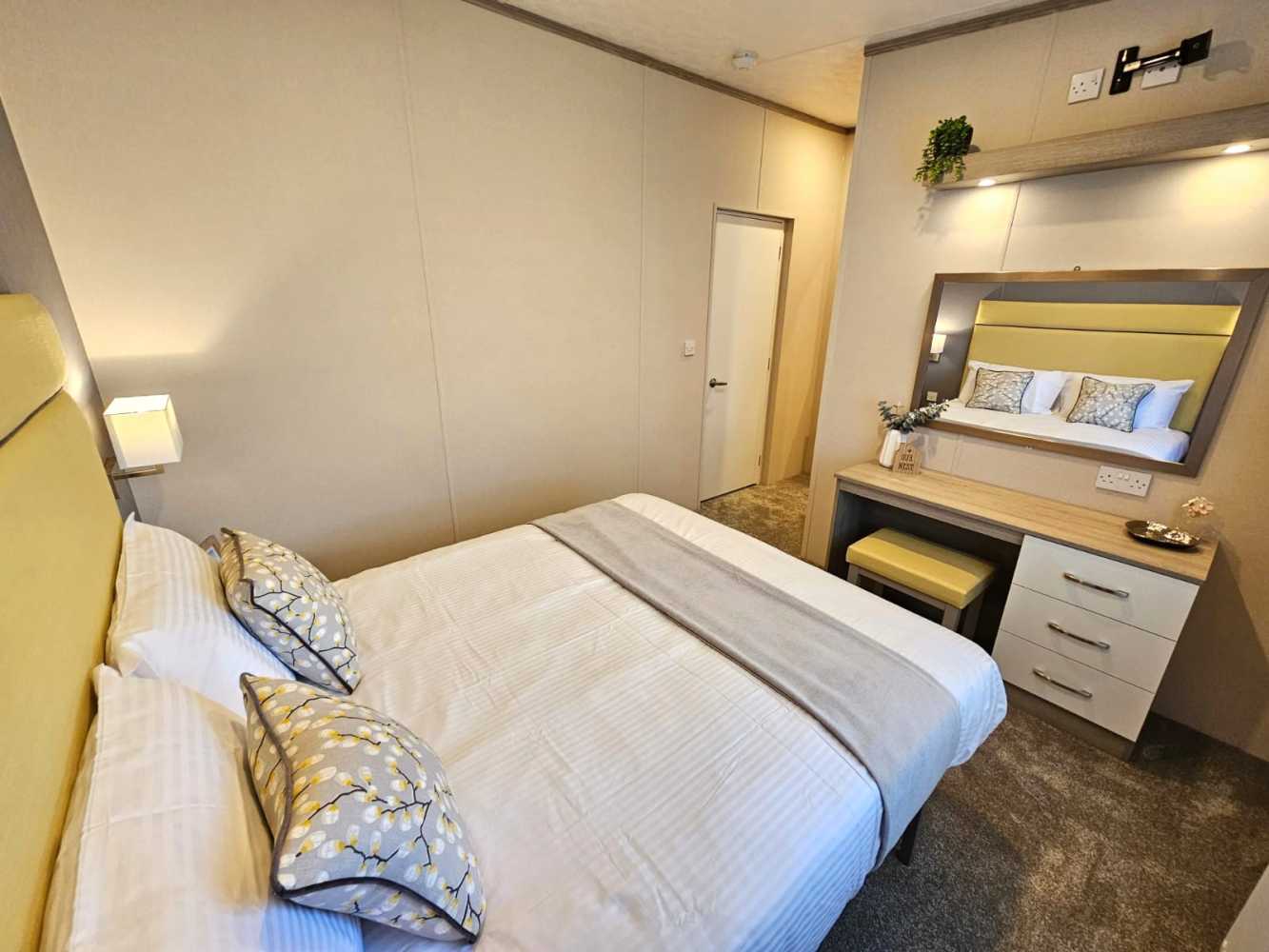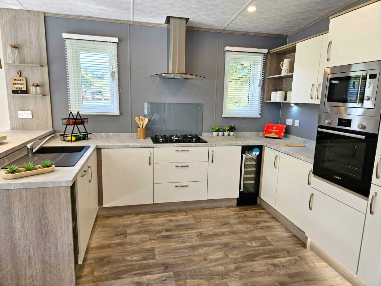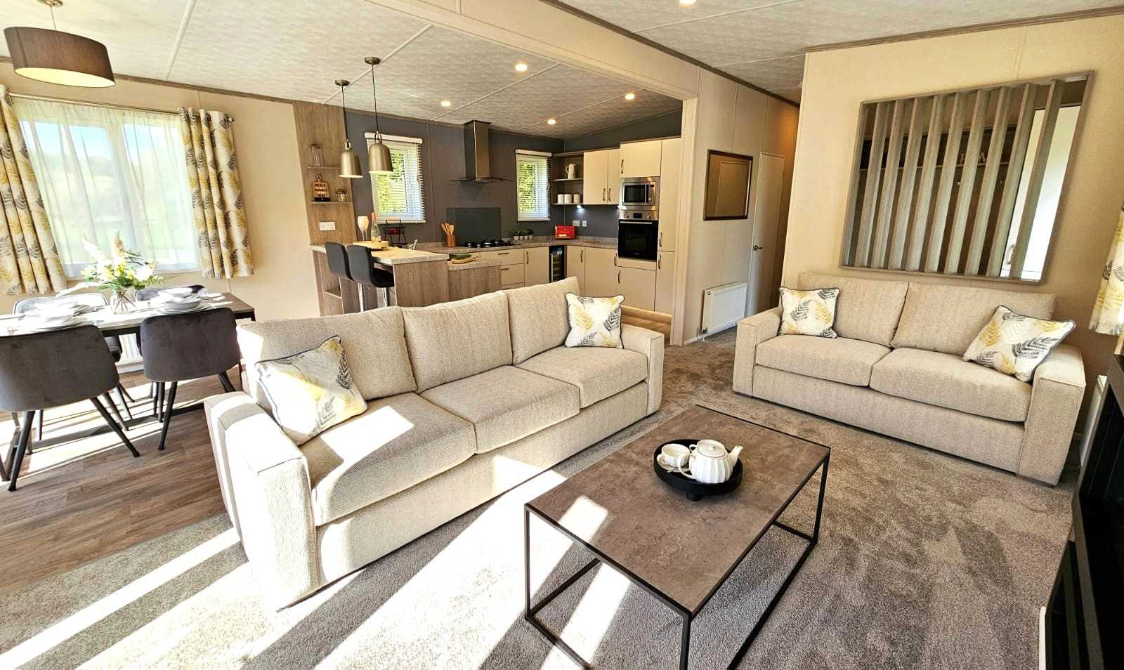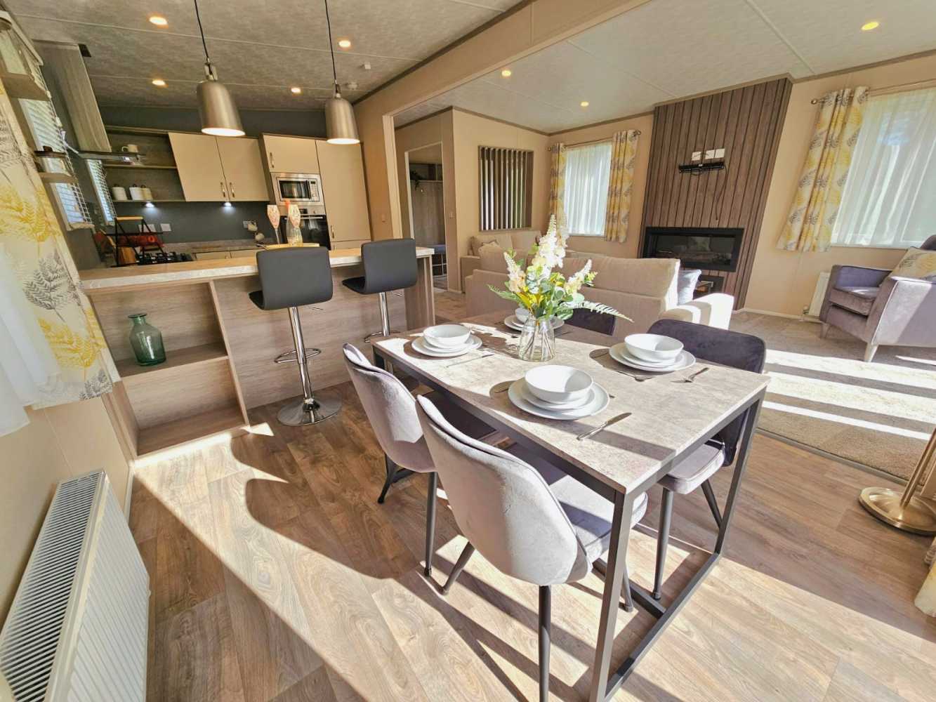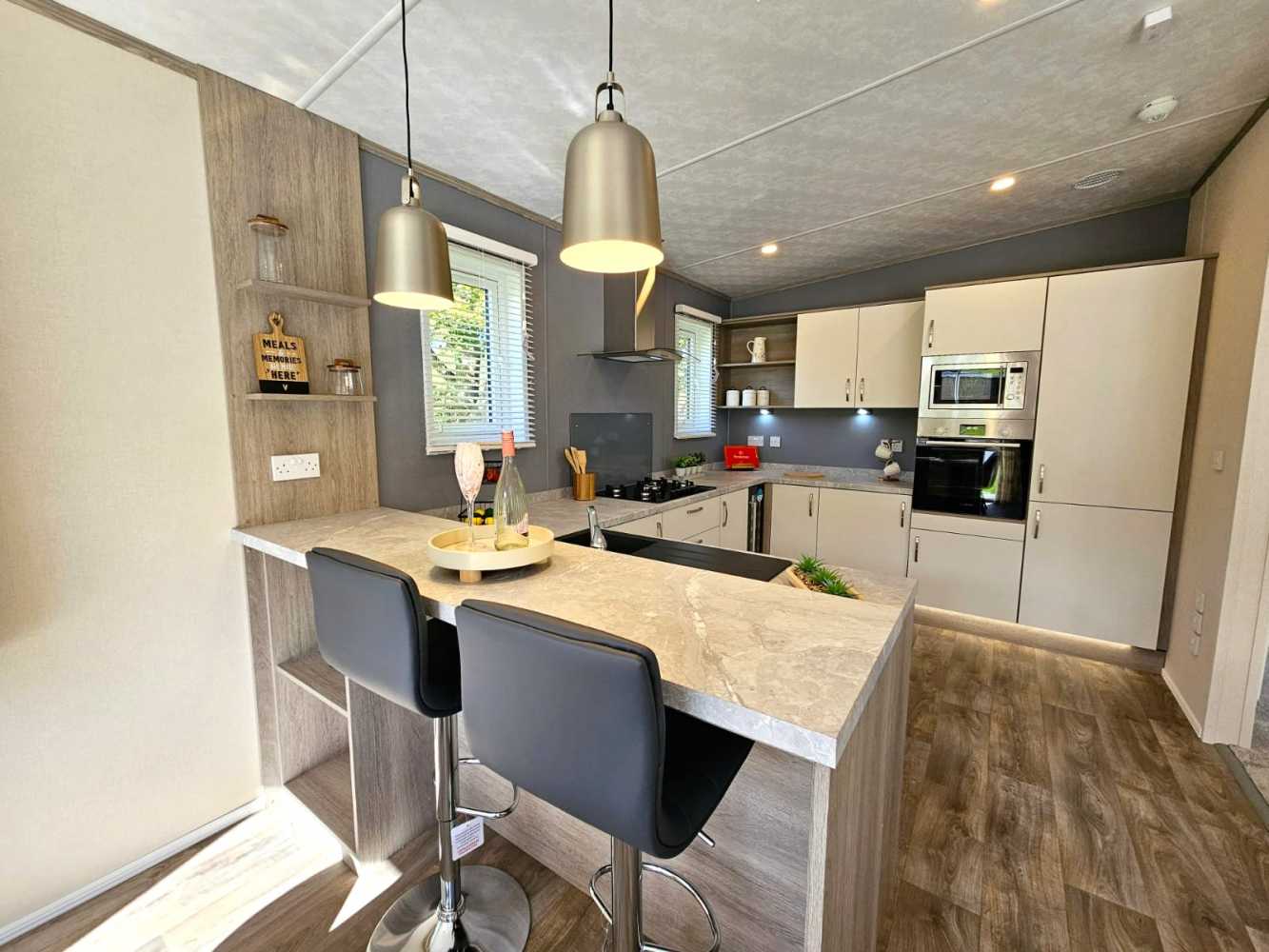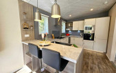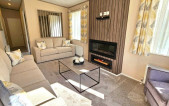 The Pemberton Skydale exudes character and charm, featuring an open-plan layout that facilitates a seamless flow between social spaces. Upon entering the lodge, guests are greeted by a generous bench seat complemented by shelving and coat hooks, providing both functionality and style. The lounge area is furnished with a spacious freestanding three-seater sofa, a sofa bed, and an accent chair, all centred around a striking feature wall that houses an electric fireplace. A coffee table, designed to match the dining table, enhances the cohesive aesthetic of the space. The expansive U-shaped kitchen offers ample room for food preparation and storage, equipped with a five-burner gas hob, oven/grill, microwave, and fridge/freezer. Additional conveniences include an integrated dishwasher and washer/dryer. The stylish breakfast bar provides extra seating for guests, creating a casual dining option. Plinth lighting and under-cupboard spotlights contribute to a warm and inviting ambiance during the evenings. The dining area features a freestanding table that introduces an industrial style element, comfortably seating four. The spacious master king-sized bedroom is complete with a large vanity unit, bedside tables with overhead lighting, and an expansive walk-in wardrobe that includes hanging space, shelving, and drawers. The en-suite bathroom is equipped with a shower, WC, hand basin with under-sink storage, a mirror, a heated towel rail, and a storage cabinet. The twin bedroom is adorned with striking fabric headboards, bedside tables, a vanity unit, and a walk-in wardrobe featuring a set of drawers. The main bathroom offers a spacious shower, WC, hand basin with under-sink storage, a heated towel rail, a mirror, and a storage cabinet. The Skydale is enhanced by large front windows and French doors that invite an abundance of natural light, creating a bright and airy atmosphere. The French doors open onto a generous front decking area, allowing you to fully embrace your surroundings. Please note the skirting and decking is due for installation.