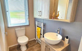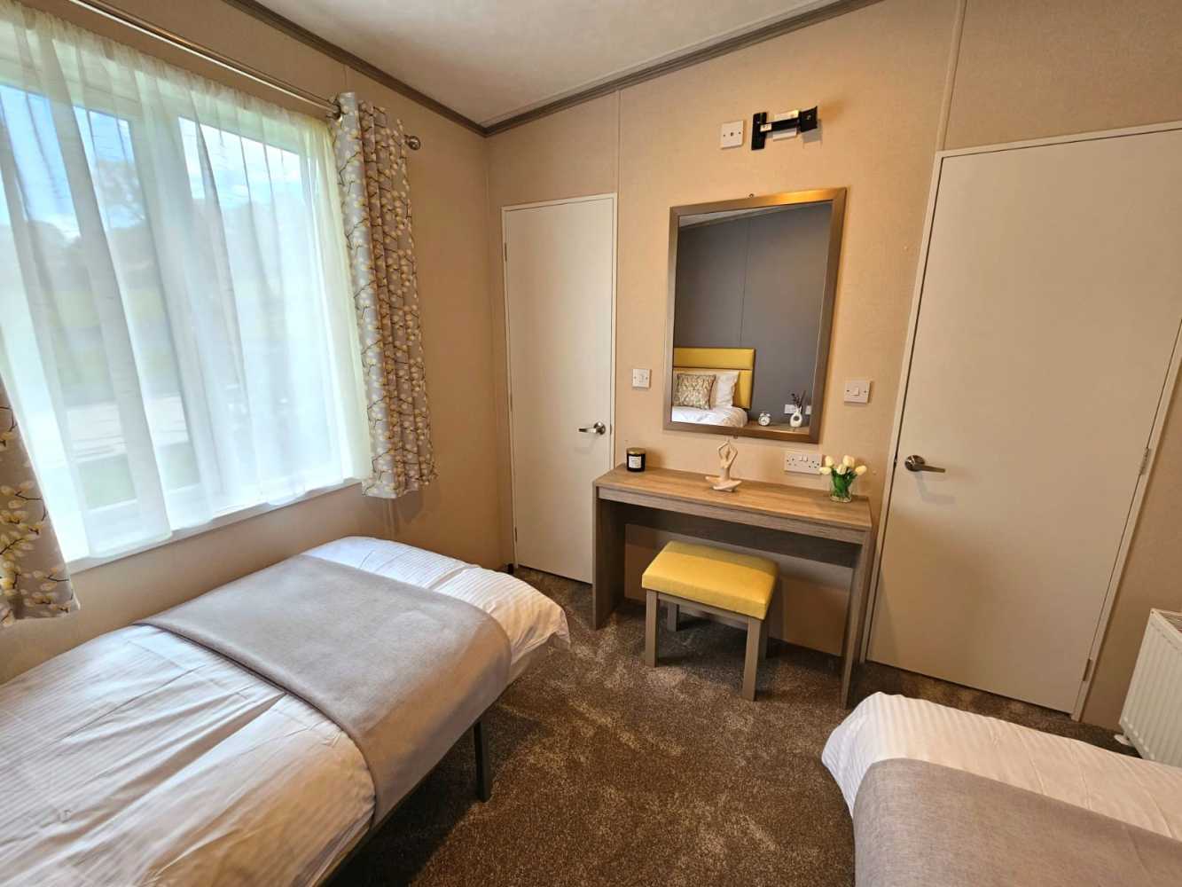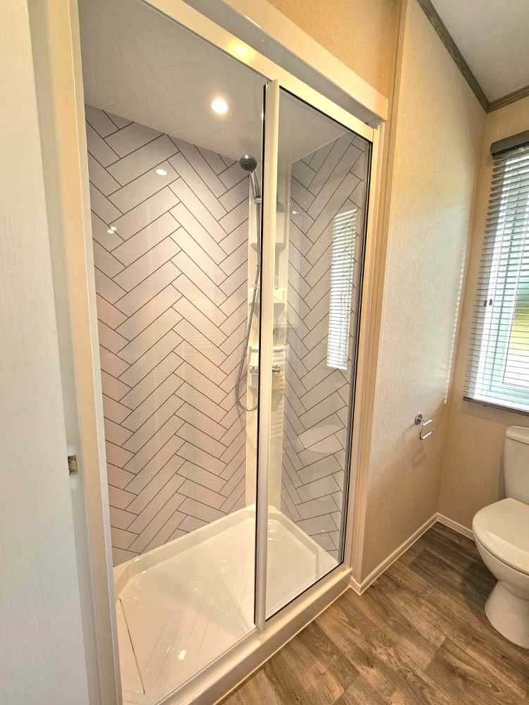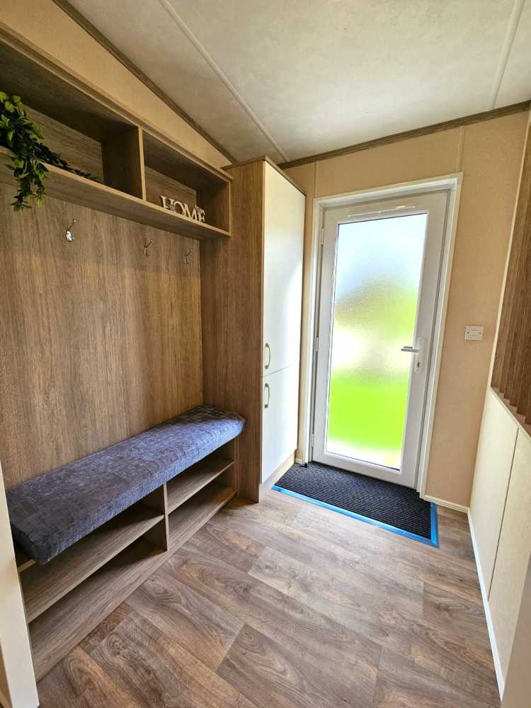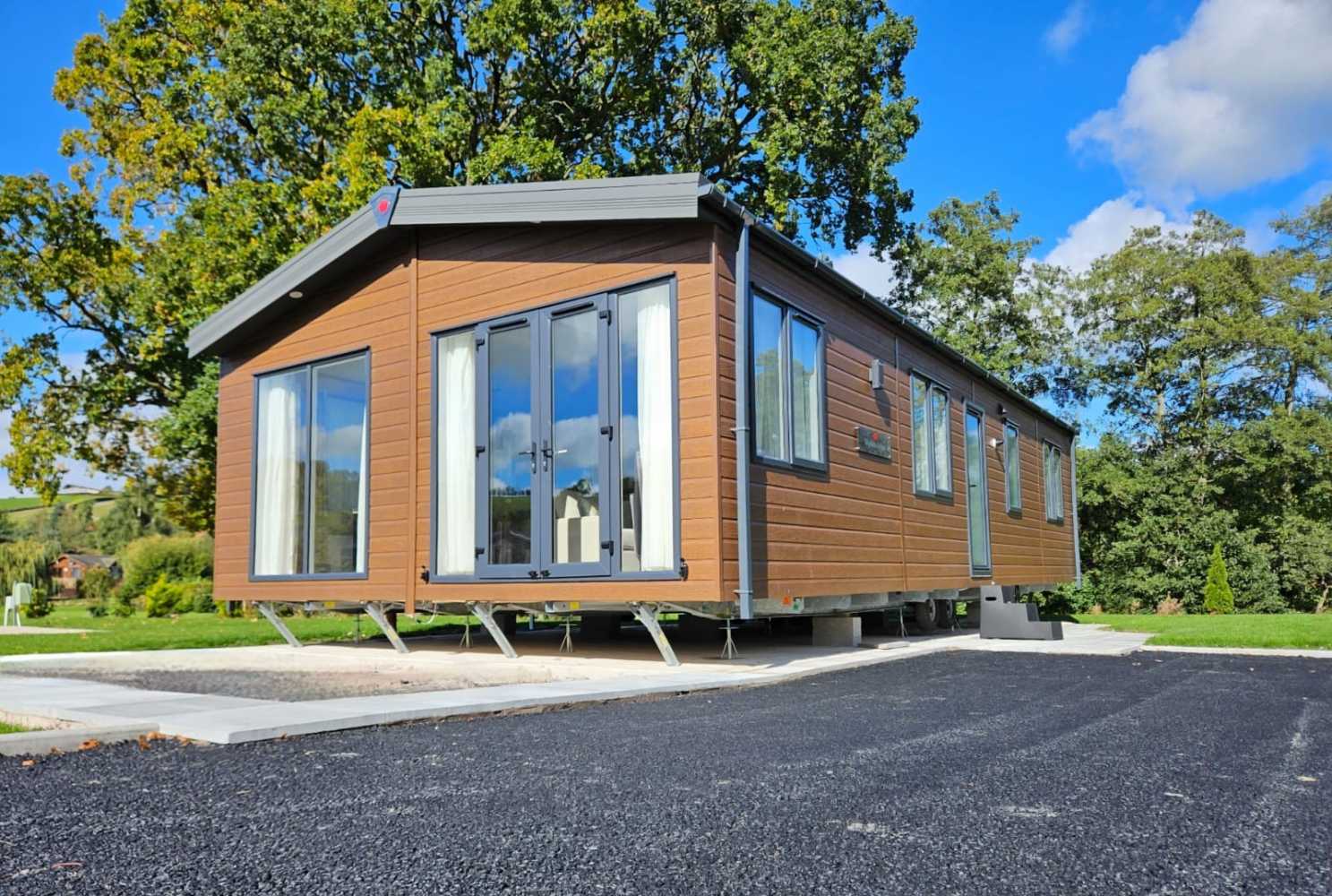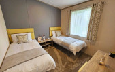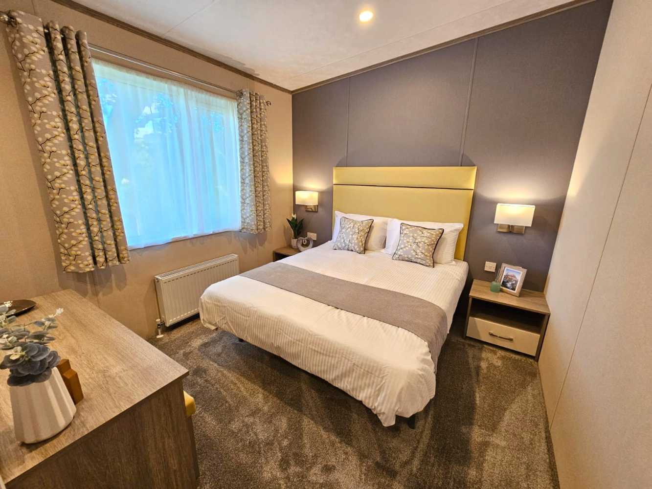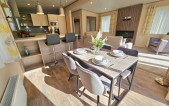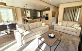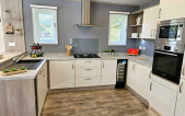 The Pemberton Skydale exudes character and charm, featuring an open-plan layout that facilitates a seamless flow between social spaces. Upon entering the lodge, guests are greeted by a generous bench seat complemented by shelving and coat hooks, providing both functionality and style. The lounge area is furnished with a spacious freestanding three-seater sofa, a sofa bed, and an accent chair, all centred around a striking feature wall that houses an electric fireplace. A coffee table, designed to match the dining table, enhances the cohesive aesthetic of the space. The expansive U-shaped kitchen offers ample room for food preparation and storage, equipped with a five-burner gas hob, oven/grill, microwave, and fridge/freezer. Additional conveniences include an integrated dishwasher and washer/dryer. The stylish breakfast bar provides extra seating for guests, creating a casual dining option. Plinth lighting and under-cupboard spotlights contribute to a warm and inviting ambiance during the evenings. The dining area features a freestanding table that introduces an industrial style element, comfortably seating four. The spacious master king-sized bedroom is complete with a large vanity unit, bedside tables with overhead lighting, and an expansive walk-in wardrobe that includes hanging space, shelving, and drawers. The en-suite bathroom is equipped with a shower, WC, hand basin with under-sink storage, a mirror, a heated towel rail, and a storage cabinet. The twin bedroom is adorned with striking fabric headboards, bedside tables, a vanity unit, and a walk-in wardrobe featuring a set of drawers. The main bathroom offers a spacious shower, WC, hand basin with under-sink storage, a heated towel rail, a mirror, and a storage cabinet. The Skydale is enhanced by large front windows and French doors that invite an abundance of natural light, creating a bright and airy atmosphere. The French doors open onto a generous front decking area, allowing you to fully embrace your surroundings. Please note the skirting and decking is due for installation.