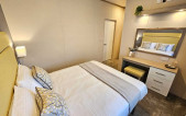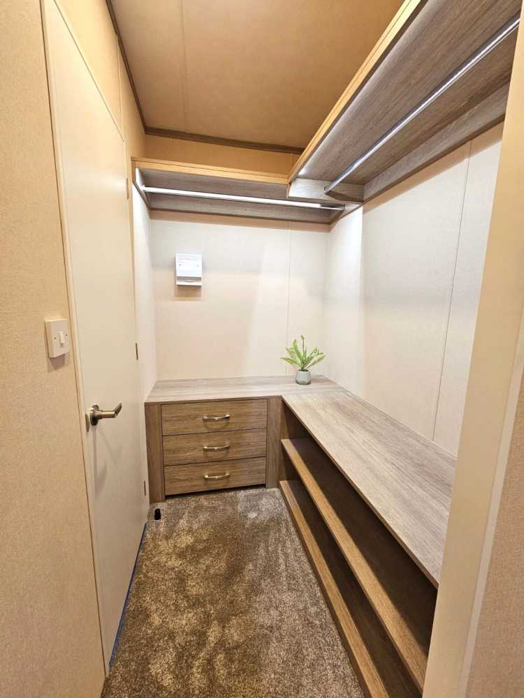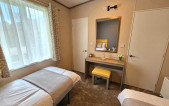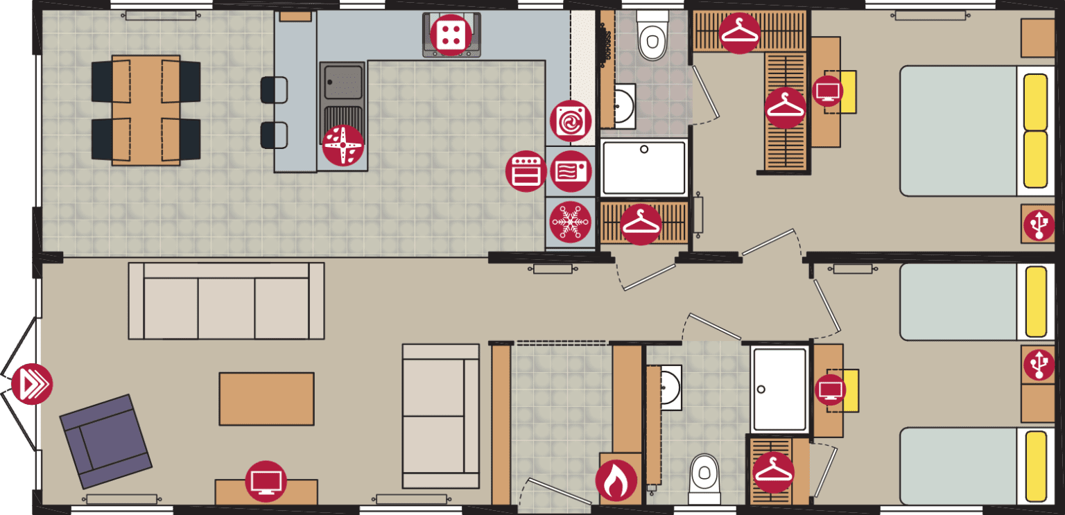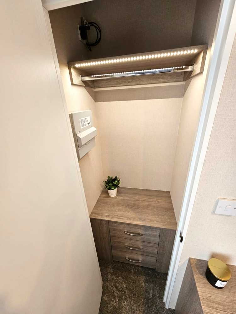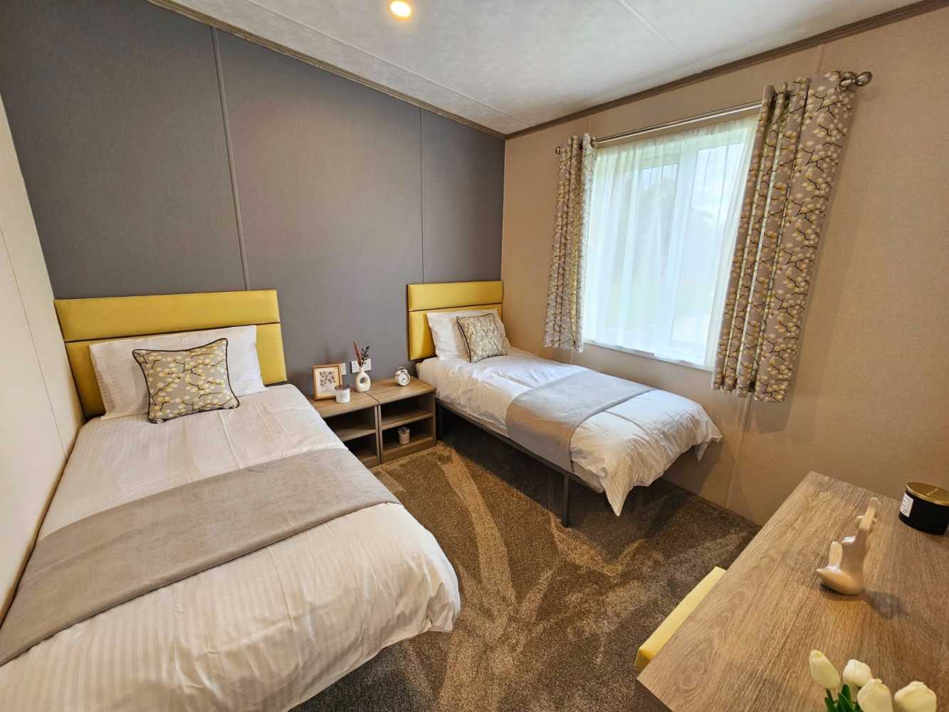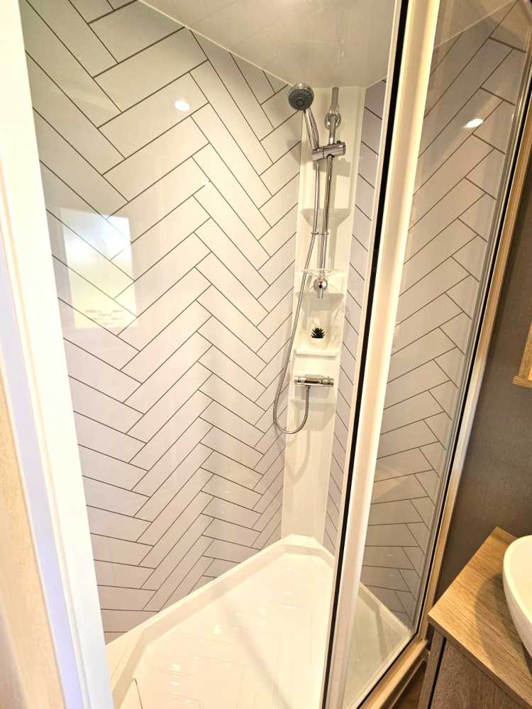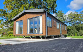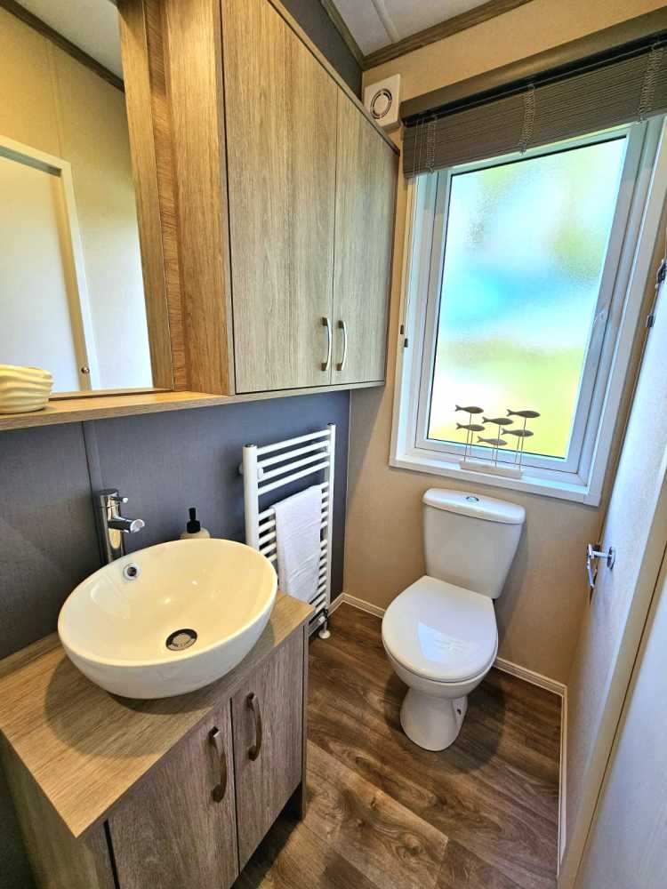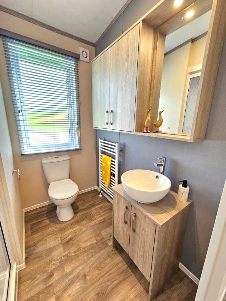The Pemberton Skydale exudes character and charm, featuring an open-plan layout that facilitates a seamless flow between social spaces. Upon entering the lodge, guests are greeted by a generous bench seat complemented by shelving and coat hooks, providing both functionality and style. The lounge area is furnished with a spacious freestanding three-seater sofa, a sofa bed, and an accent chair, all centred around a striking feature wall that houses an electric fireplace. A coffee table, designed to match the dining table, enhances the cohesive aesthetic of the space. The expansive U-shaped kitchen offers ample room for food preparation and storage, equipped with a five-burner gas hob, oven/grill, microwave, and fridge/freezer. Additional conveniences include an integrated dishwasher and washer/dryer. The stylish breakfast bar provides extra seating for guests, creating a casual dining option. Plinth lighting and under-cupboard spotlights contribute to a warm and inviting ambiance during the evenings. The dining area features a freestanding table that introduces an industrial style element, comfortably seating four. The spacious master king-sized bedroom is complete with a large vanity unit, bedside tables with overhead lighting, and an expansive walk-in wardrobe that includes hanging space, shelving, and drawers. The en-suite bathroom is equipped with a shower, WC, hand basin with under-sink storage, a mirror, a heated towel rail, and a storage cabinet. The twin bedroom is adorned with striking fabric headboards, bedside tables, a vanity unit, and a walk-in wardrobe featuring a set of drawers. The main bathroom offers a spacious shower, WC, hand basin with under-sink storage, a heated towel rail, a mirror, and a storage cabinet. The Skydale is enhanced by large front windows and French doors that invite an abundance of natural light, creating a bright and airy atmosphere. The French doors open onto a generous front decking area, allowing you to fully embrace your surroundings. Please note the skirting and decking is due for installation.