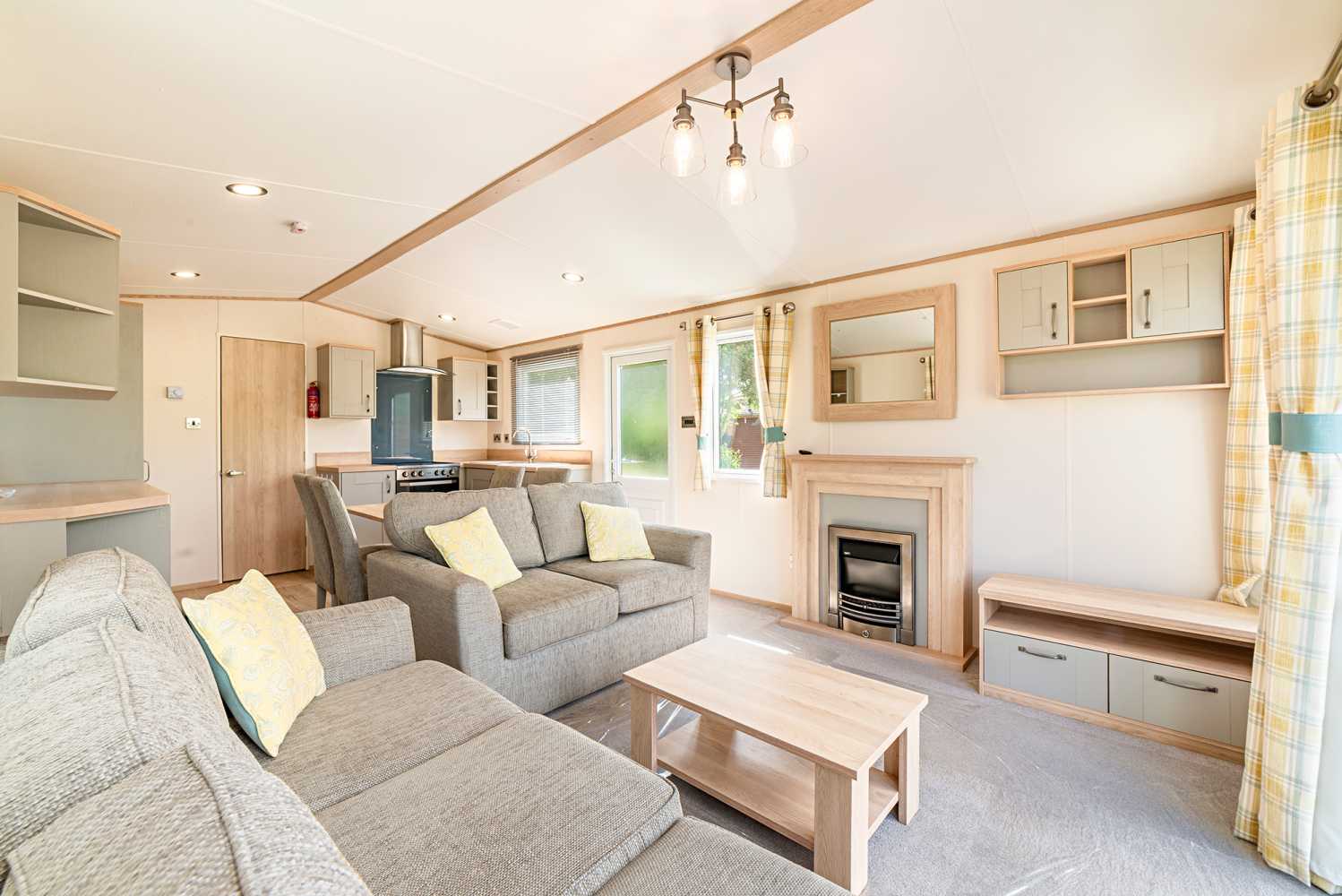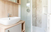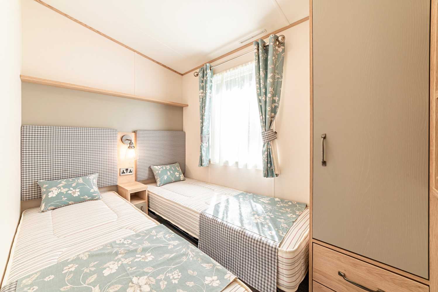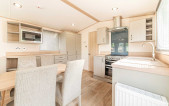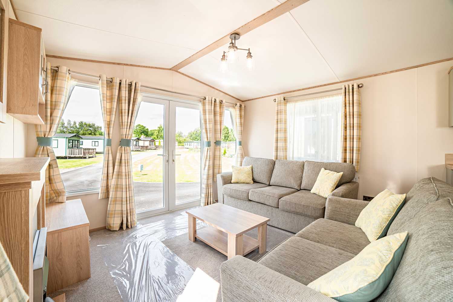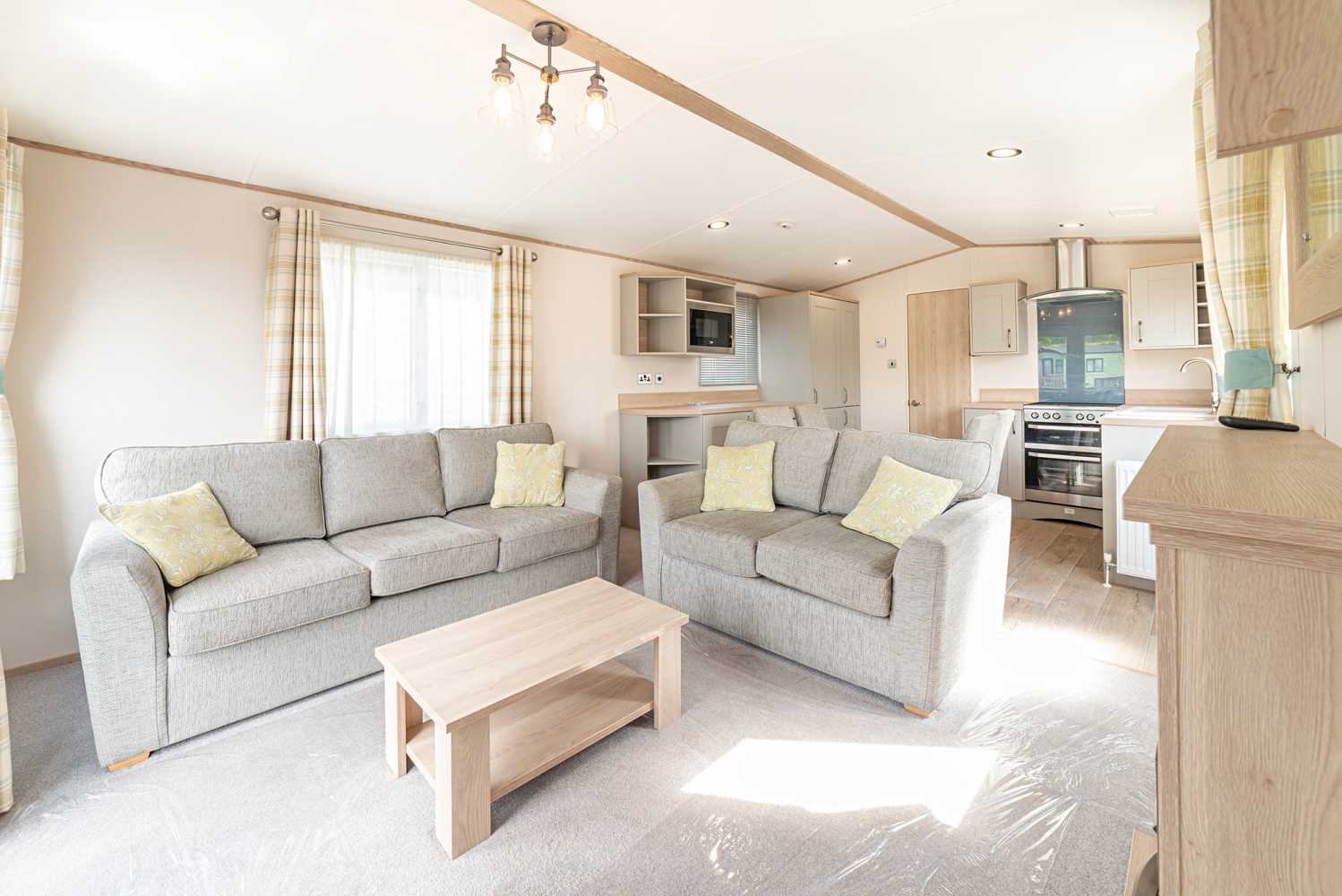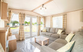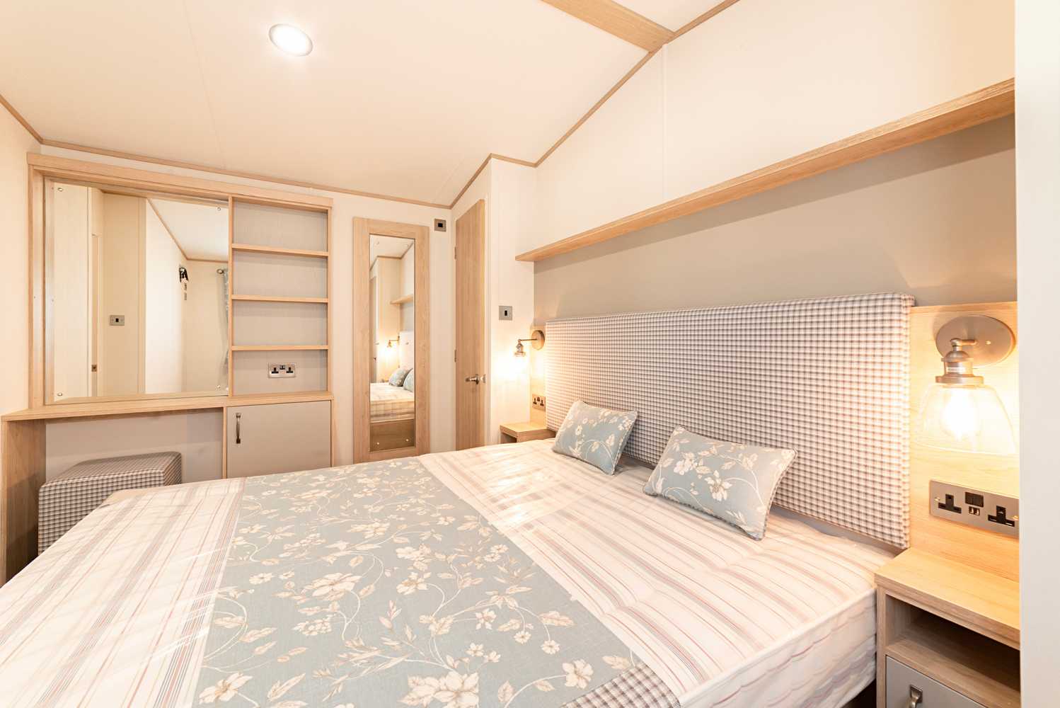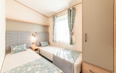 The ABI Windermere features a spacious, open-plan living area, complete with large patio doors and stylish freestanding furniture. As you enter through the side door, you’ll find yourself in a well-equipped kitchen and dining space, with a table that comfortably seats four. The modern kitchen boasts ample worktop space on either side, as well as an eye-level microwave, fridge/freezer, dishwasher, and washing machine. Thanks to the glazed side door and windows on both sides, the space is filled with natural light, making it bright and welcoming. In the lounge area, two generously sized sofas a three-seater and a two-seater provide plenty of seating. One of the sofas also doubles as a sofa-bed for additional guests. The decor features soothing grey tones, with plenty of surfaces where you can add your own personal touches. Heading back through the kitchen and down the corridor, you’ll find a family shower room, a twin guest bedroom with two single beds, and the main bedroom. The master suite includes a walk-in wardrobe, a dressing table, a full-length mirror, and its own en-suite shower room.