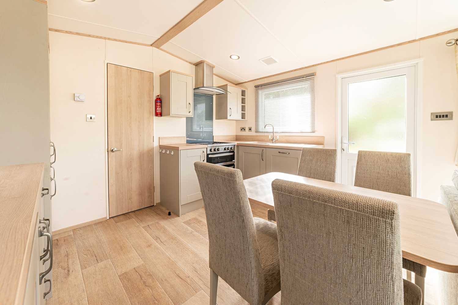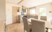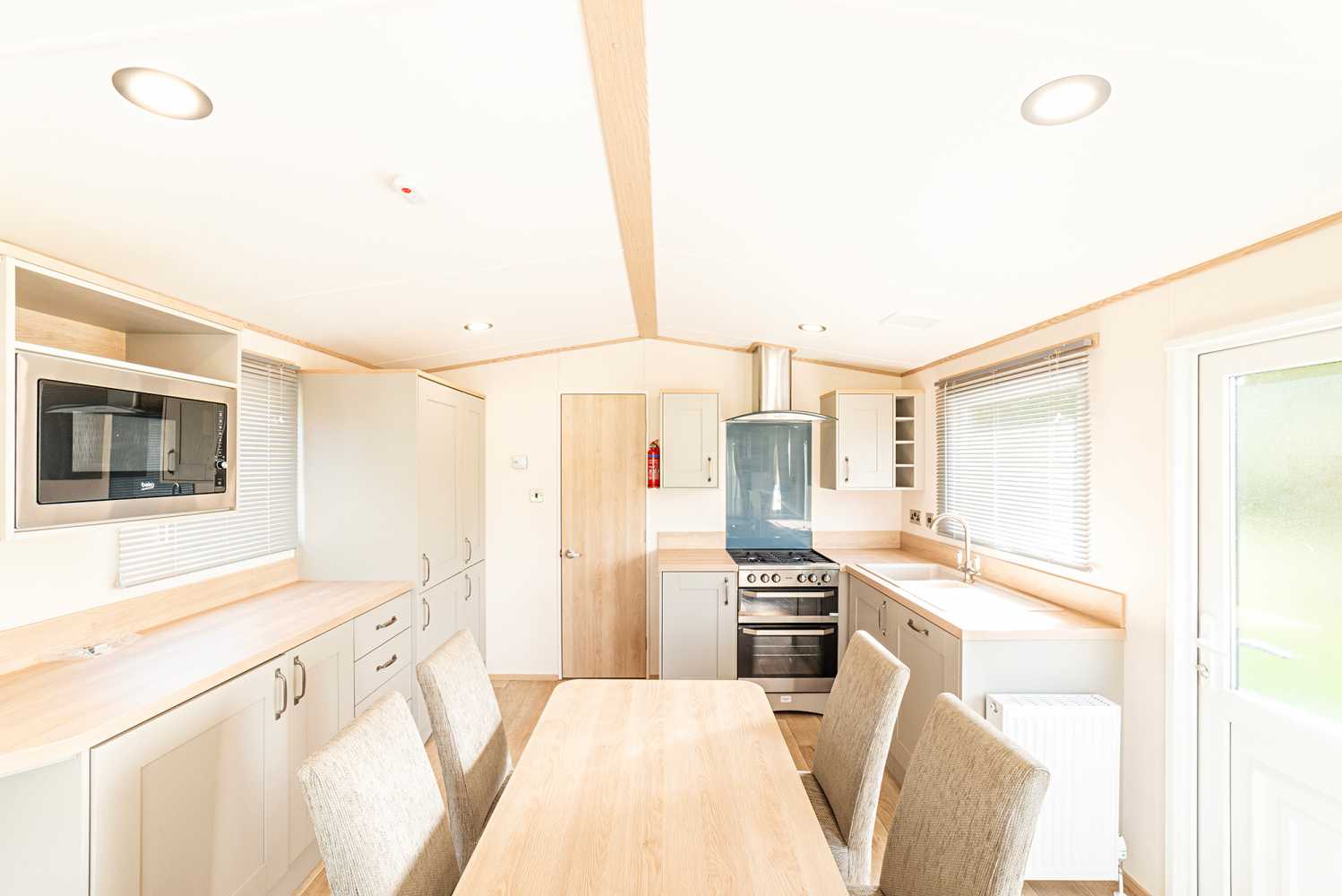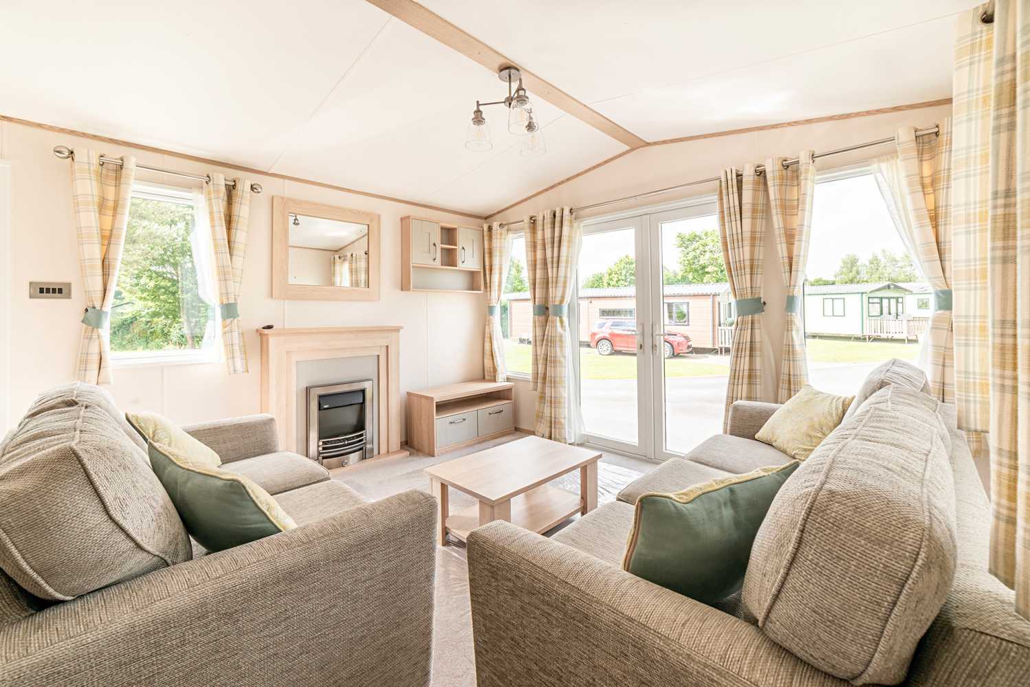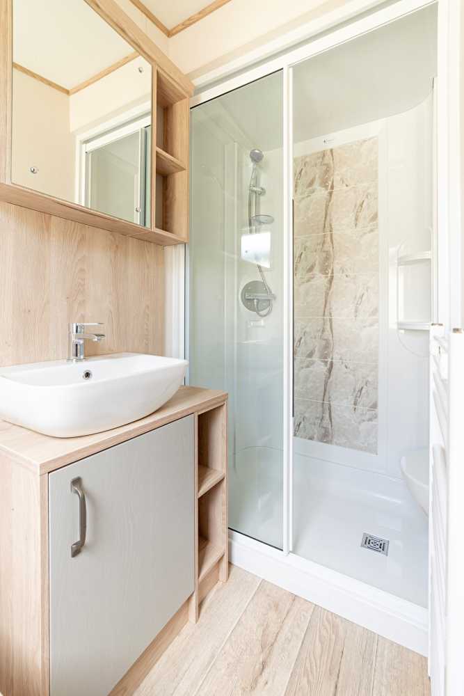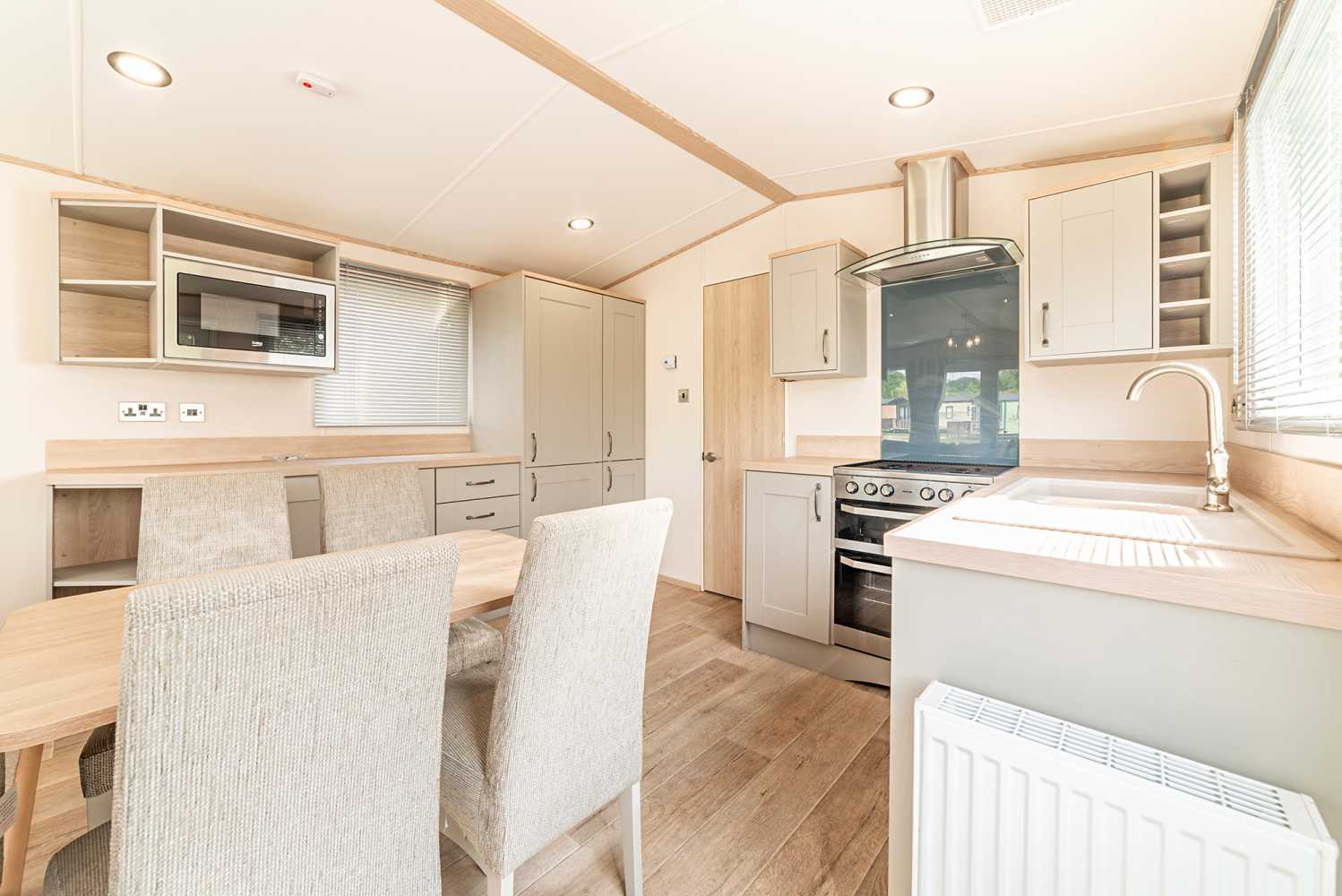 The ABI Windermere features a spacious, open-plan living area, complete with large patio doors and stylish freestanding furniture. As you enter through the side door, you’ll find yourself in a well-equipped kitchen and dining space, with a table that comfortably seats four. The modern kitchen boasts ample worktop space on either side, as well as an eye-level microwave, fridge/freezer, dishwasher, and washing machine. Thanks to the glazed side door and windows on both sides, the space is filled with natural light, making it bright and welcoming. In the lounge area, two generously sized sofas a three-seater and a two-seater provide plenty of seating. One of the sofas also doubles as a sofa-bed for additional guests. The decor features soothing grey tones, with plenty of surfaces where you can add your own personal touches. Heading back through the kitchen and down the corridor, you’ll find a family shower room, a twin guest bedroom with two single beds, and the main bedroom. The master suite includes a walk-in wardrobe, a dressing table, a full-length mirror, and its own en-suite shower room.
