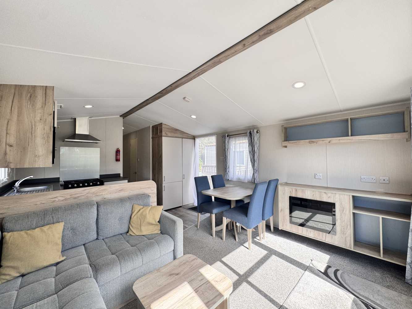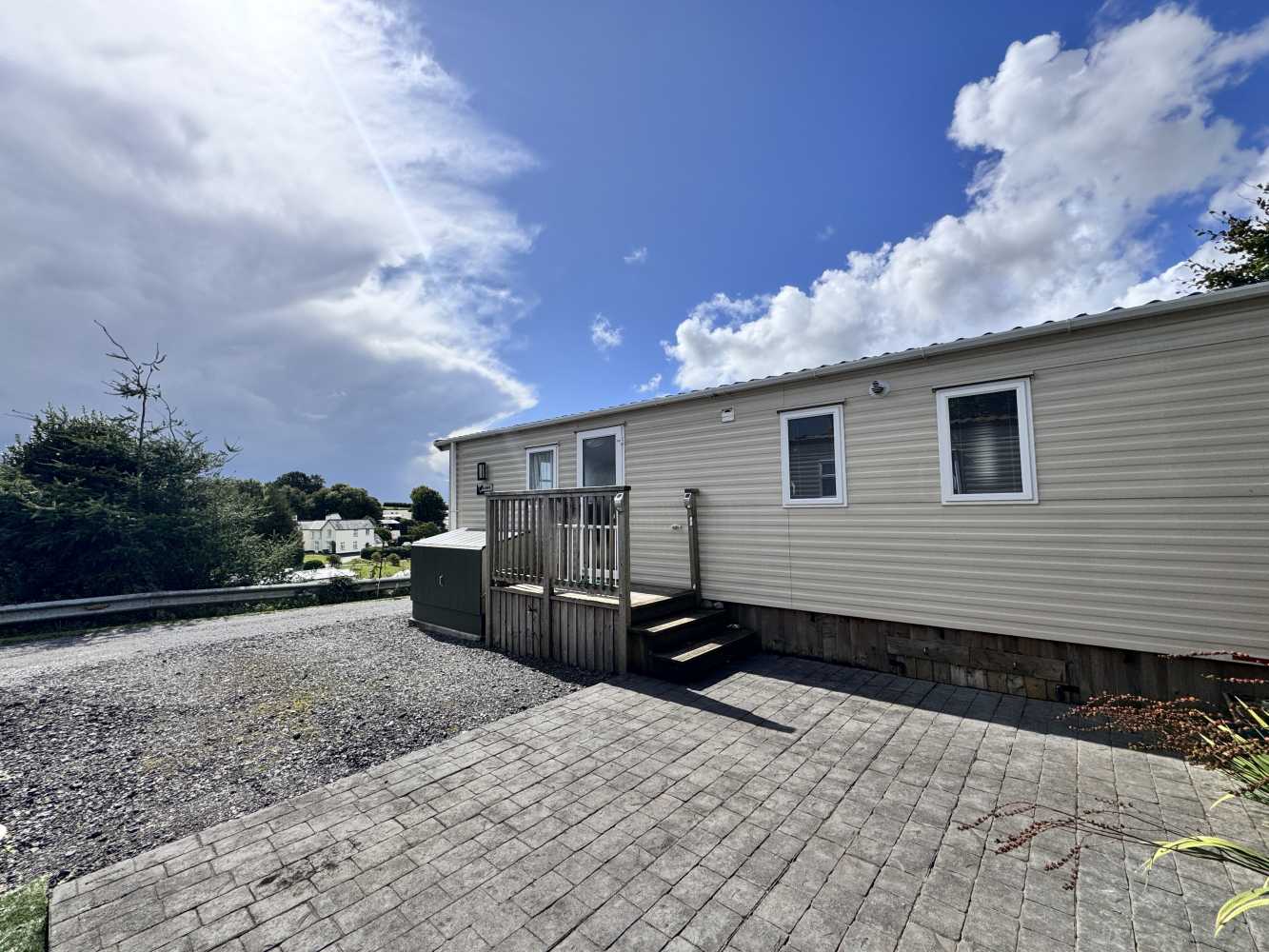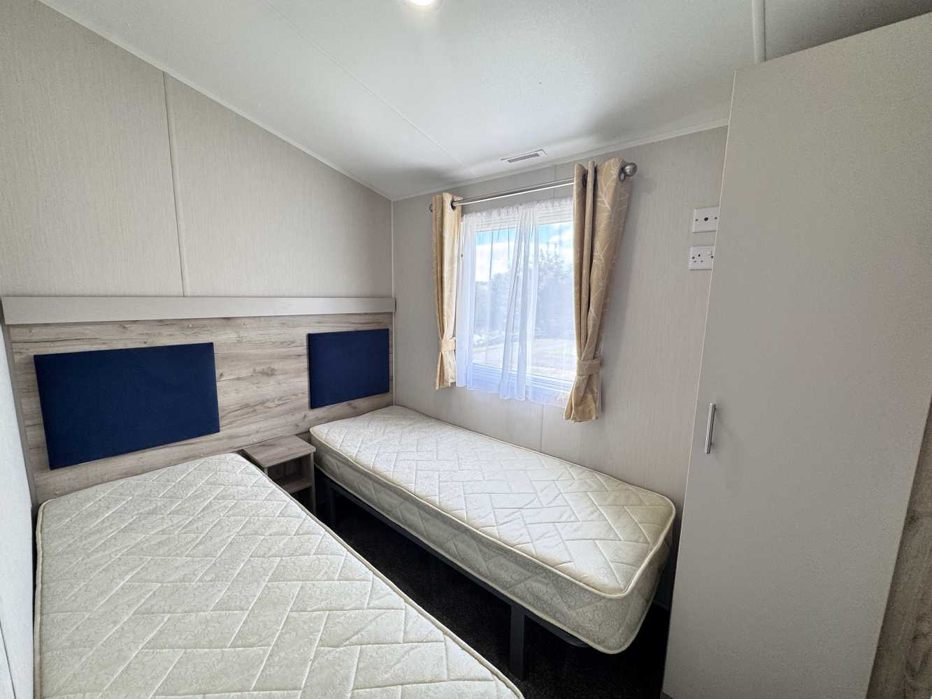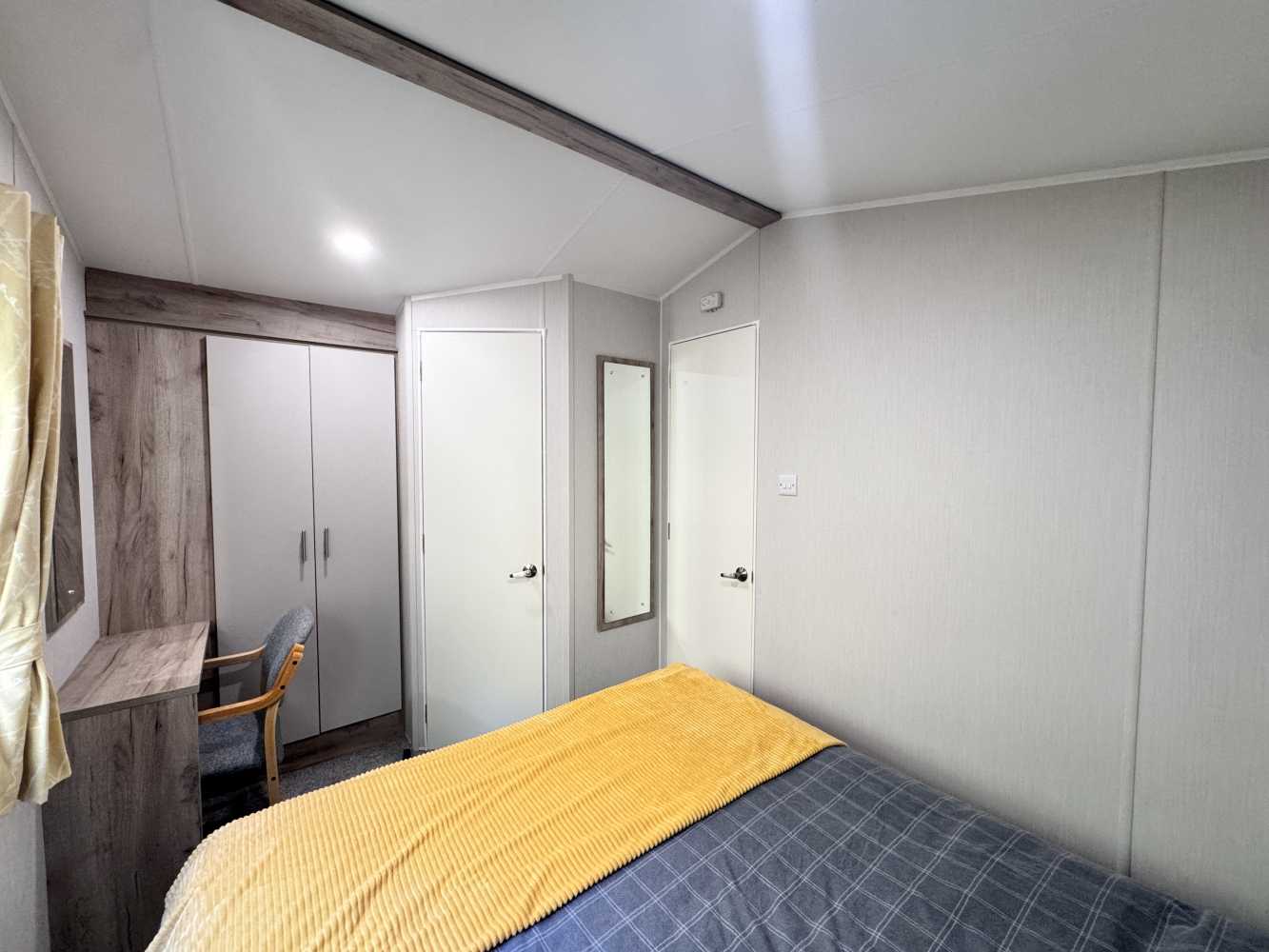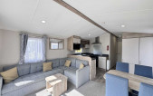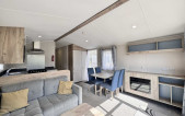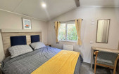 With stunning views across the park and to the farmland beyond, which can be viewed through the floor to ceiling windows, the Willerby Linwood on pitch Sycamore Way 3 is the perfect personal getaway to enjoy Smytham throughout the Seasons. Watch the surrounding leaves turn yellow, orange and brown in Autumn, snuggle on the sofa infront of the electric fire on chilly Winter nights, watch the plant life bloom in the Spring and pop to the pool to soak up the summer sun. The fully equipped kitchen with an integrated microwave and integrated fridge-freezer, along with oven, grill, hob and extractor provides all you need to prepare delicious meals during your stay. The optional extra free-standing dining table and chairs are in complimentry wood tones and upholstered fabric to match the curtains and sofa. The master bedroom features upholstered headboards, bedside tables, a vanity unit with mirror and upholstered stool, double door wardrobe, full length mirror and the extra luxury of an ensuite WC. Outside, the Linwood has a private, imprinted concrete patio backed by a stone wall and flower bed. There is an outdoor storage box large enough to store 3 adult bikes and a parking space for one car.