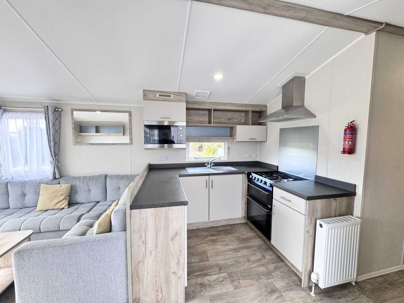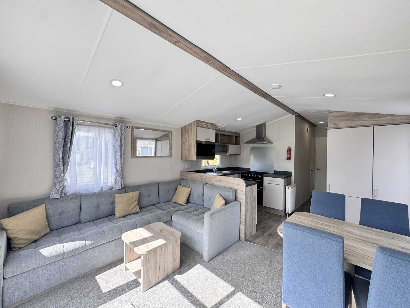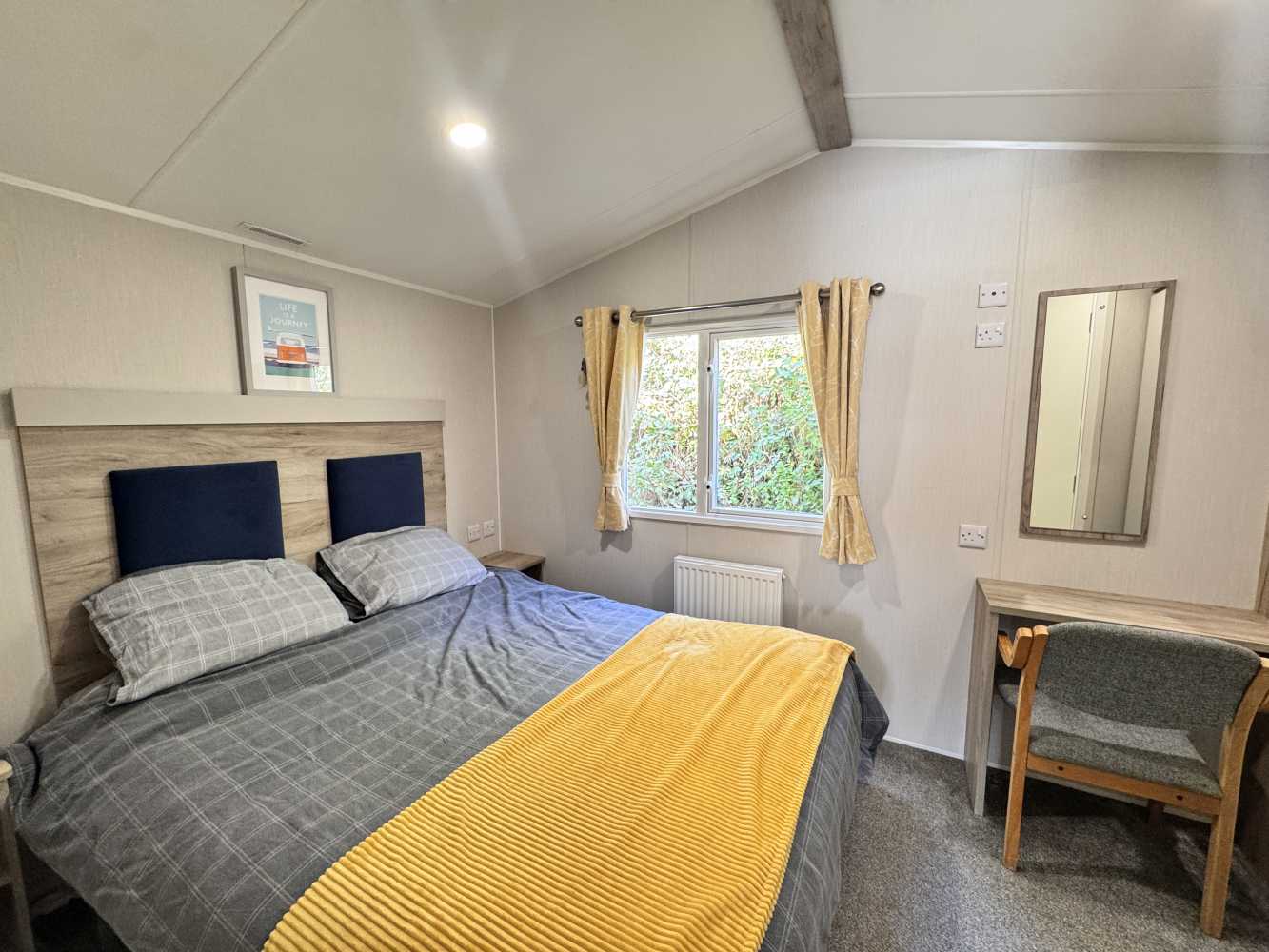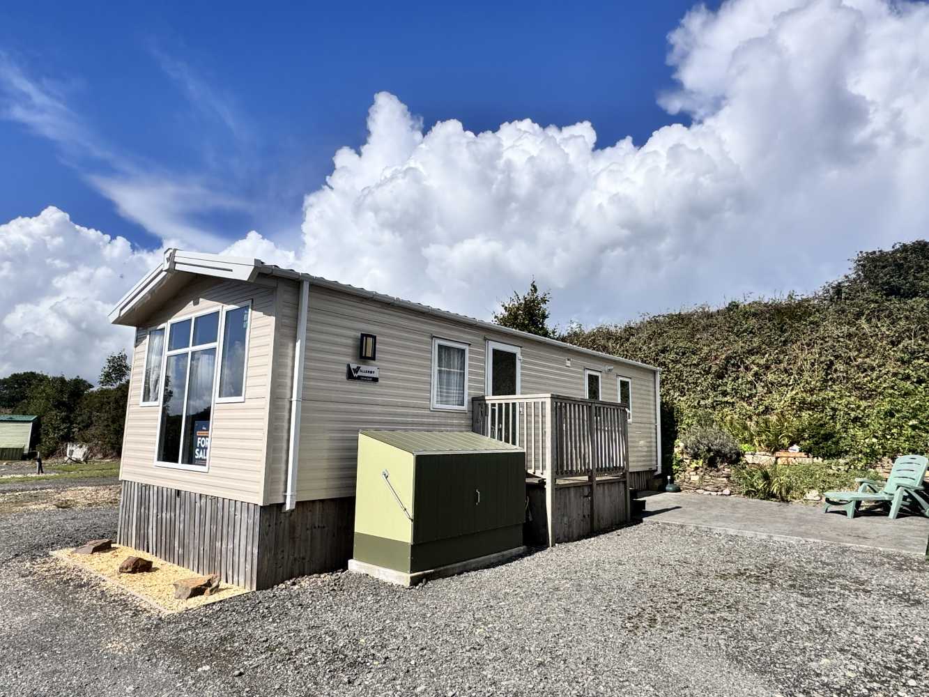 With stunning views across the park and to the farmland beyond, which can be viewed through the floor to ceiling windows, the Willerby Linwood on pitch Sycamore Way 3 is the perfect personal getaway to enjoy Smytham throughout the Seasons. Watch the surrounding leaves turn yellow, orange and brown in Autumn, snuggle on the sofa infront of the electric fire on chilly Winter nights, watch the plant life bloom in the Spring and pop to the pool to soak up the summer sun. The fully equipped kitchen with an integrated microwave and integrated fridge-freezer, along with oven, grill, hob and extractor provides all you need to prepare delicious meals during your stay. The optional extra free-standing dining table and chairs are in complimentry wood tones and upholstered fabric to match the curtains and sofa. The master bedroom features upholstered headboards, bedside tables, a vanity unit with mirror and upholstered stool, double door wardrobe, full length mirror and the extra luxury of an ensuite WC. Outside, the Linwood has a private, imprinted concrete patio backed by a stone wall and flower bed. There is an outdoor storage box large enough to store 3 adult bikes and a parking space for one car.